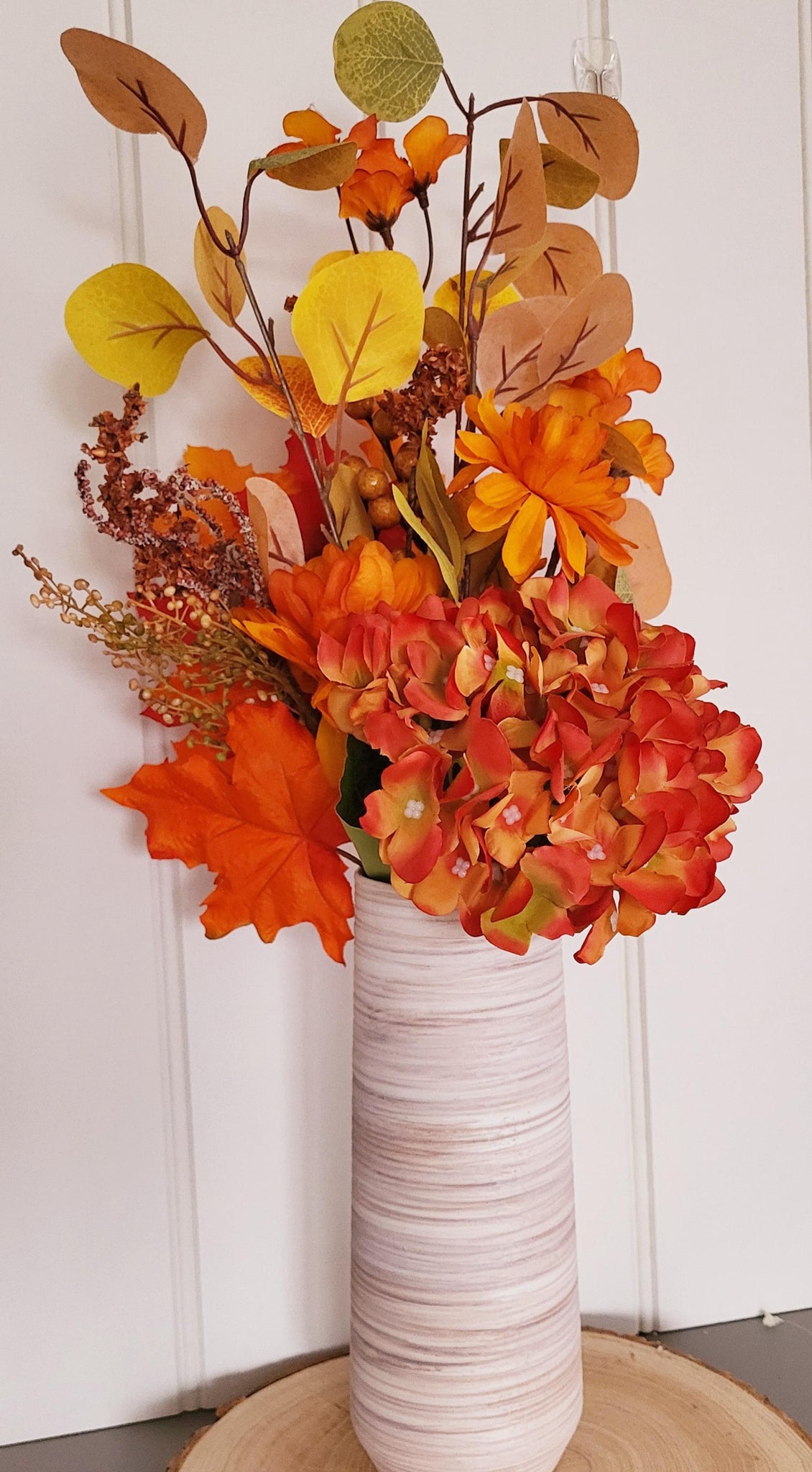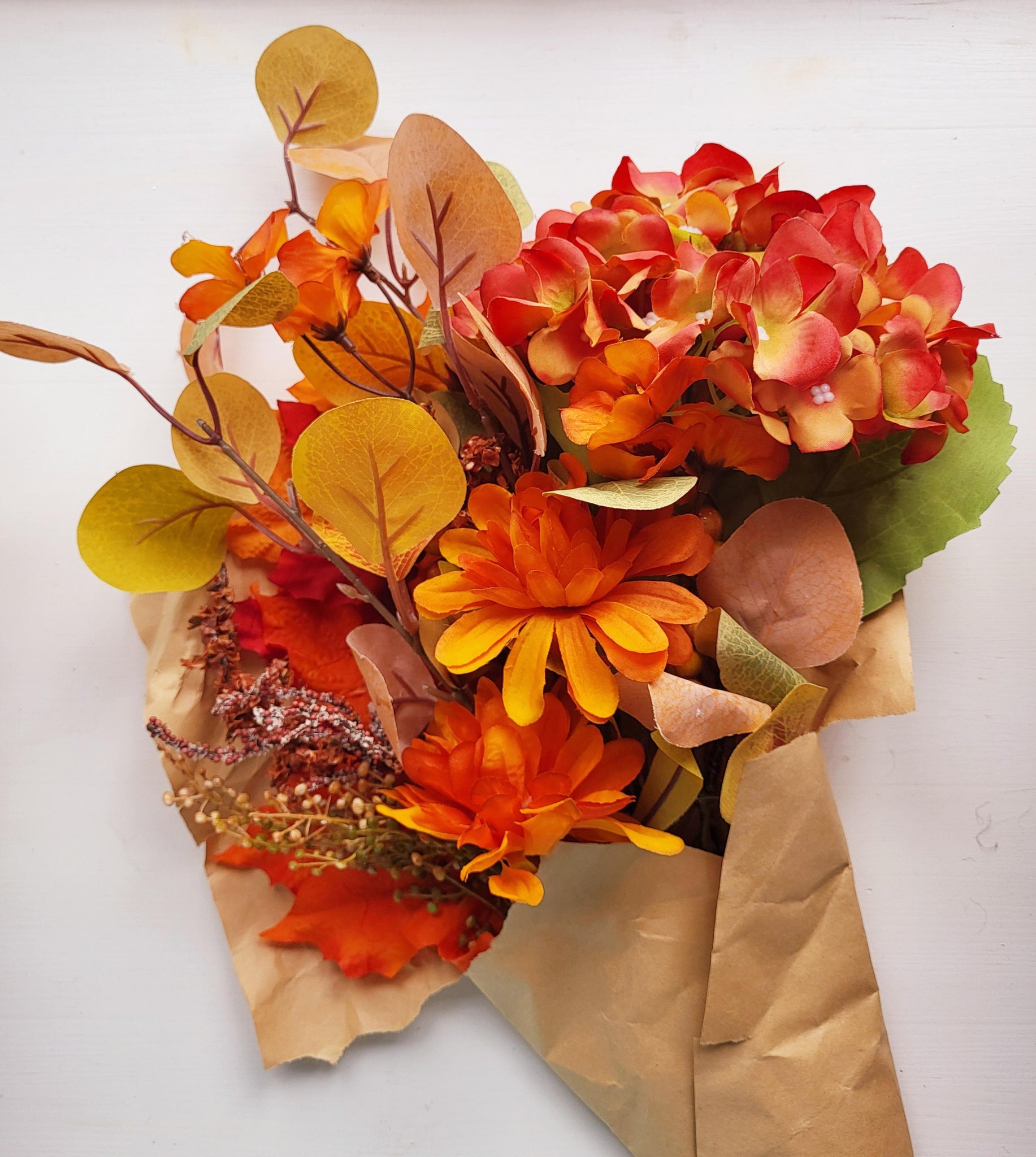 A wonderful selection of russet autumnal artificial flowers ,foliage and berries in beautiful oranges , reds and russet colours mirroring the season.