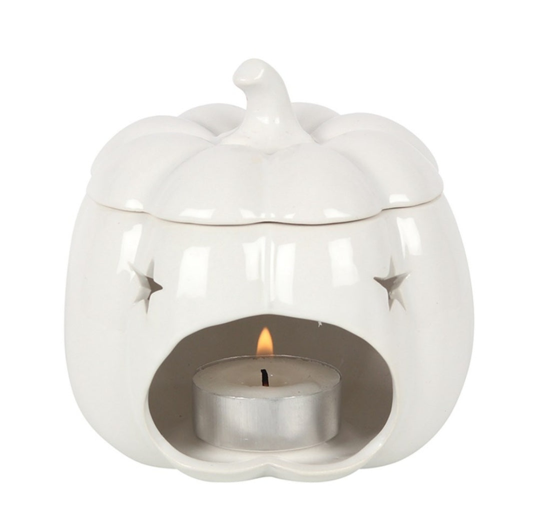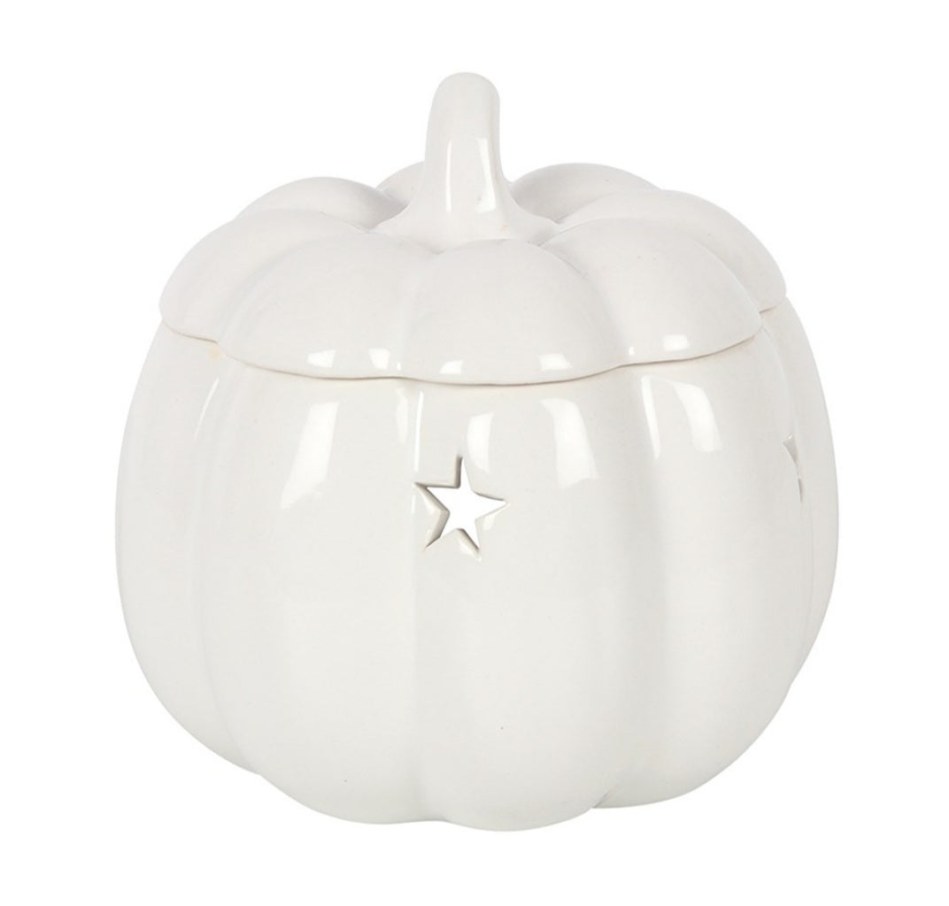 Create a cosy mood this autumn with an elegant, white ceramic pumpkin oil burner and wax warmer. Simply place a lit tealight inside and add an autumnal fragrance oil or wax melt under the lid - a lovely glow emanating from the little cut out stars.