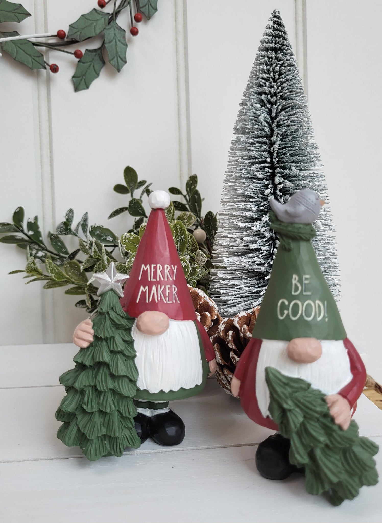 Adorable gonk figures , Merry Maker - Red - or Be Good - Green - each with their Christmas trees and be good even has a little bird in his hat. These are resin but have a carved wood style , really lovely.
