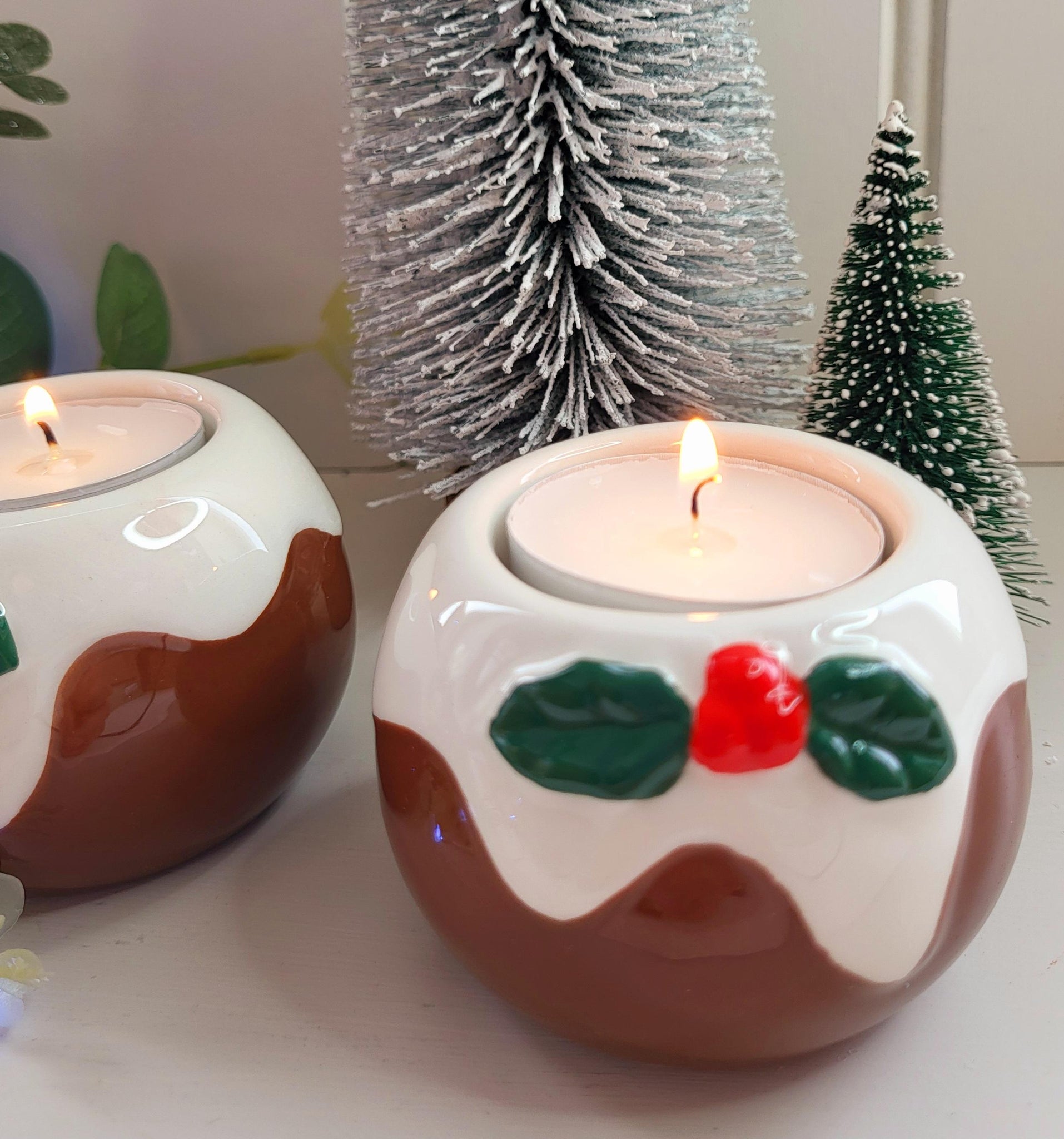 This cute ceramic tea light holder is perfect for the festive season shaped and decorated like a traditional Christmas pudding.