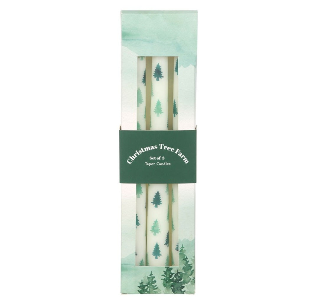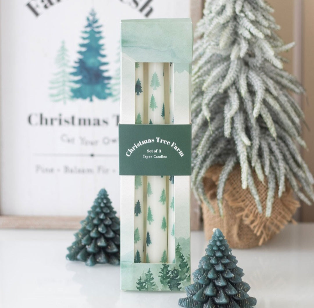 A gorgeous set of 3 tapered white dinner candles decorated with green fir trees . A great festive addition to any table.