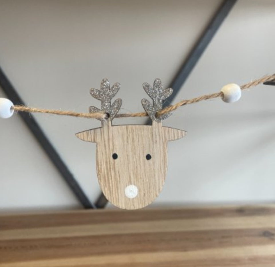 Sure to add a festive and fun touch to your tree or mantle at Christmas, a wooden garland with a reindeer and star look