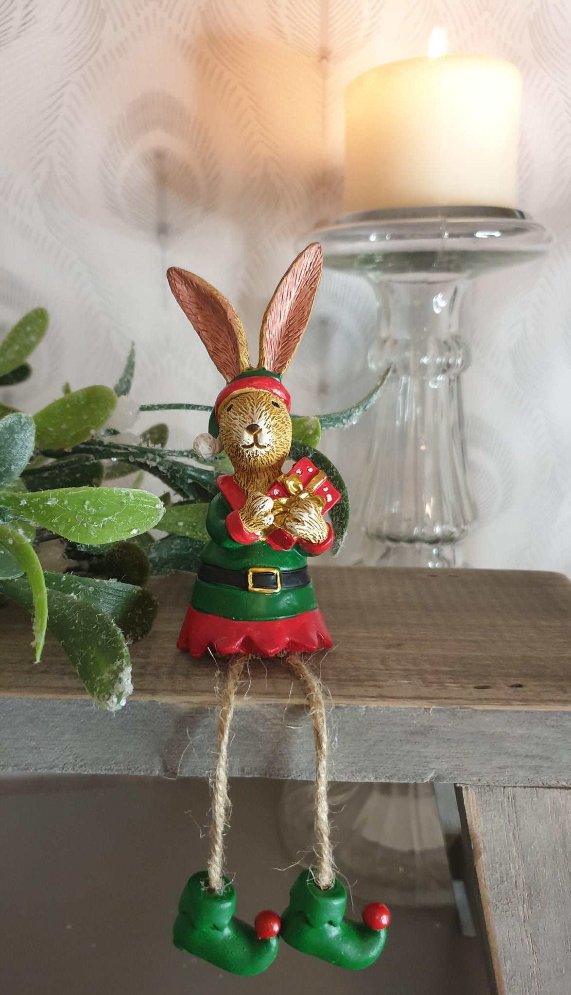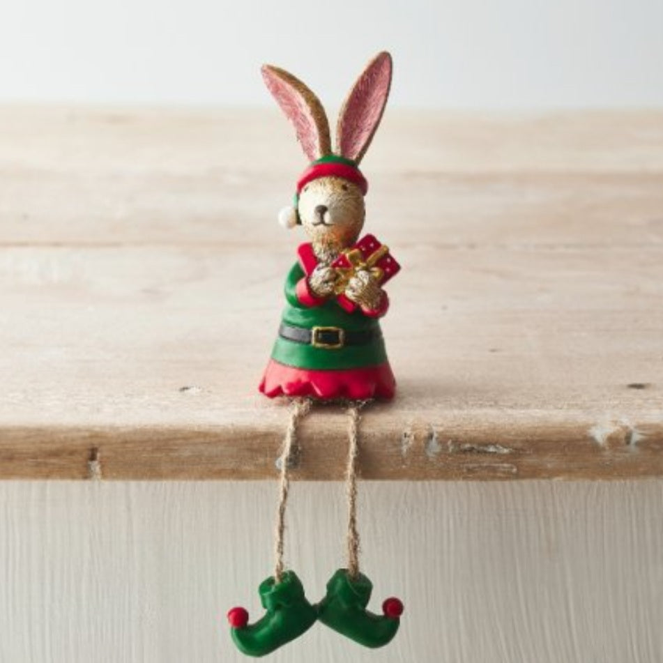 An adorable resin bunny ornament dressed as an elf holding a christmas gift, he even has little elf boots on!! Standing or sitting with dangly legs. A fun little ornament for Christmas .