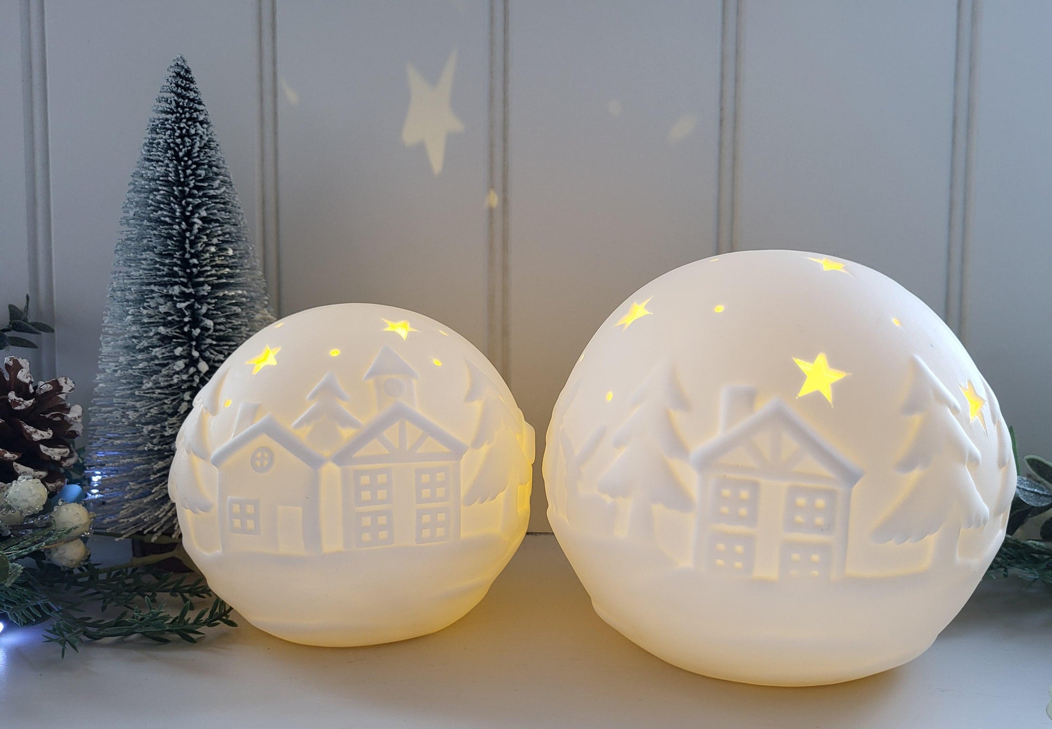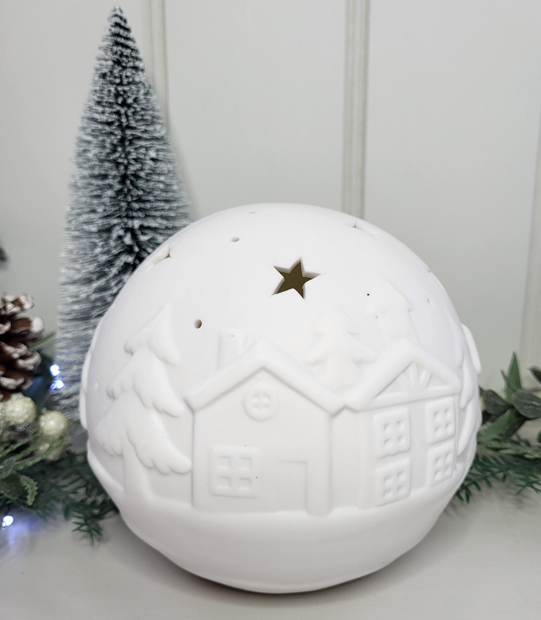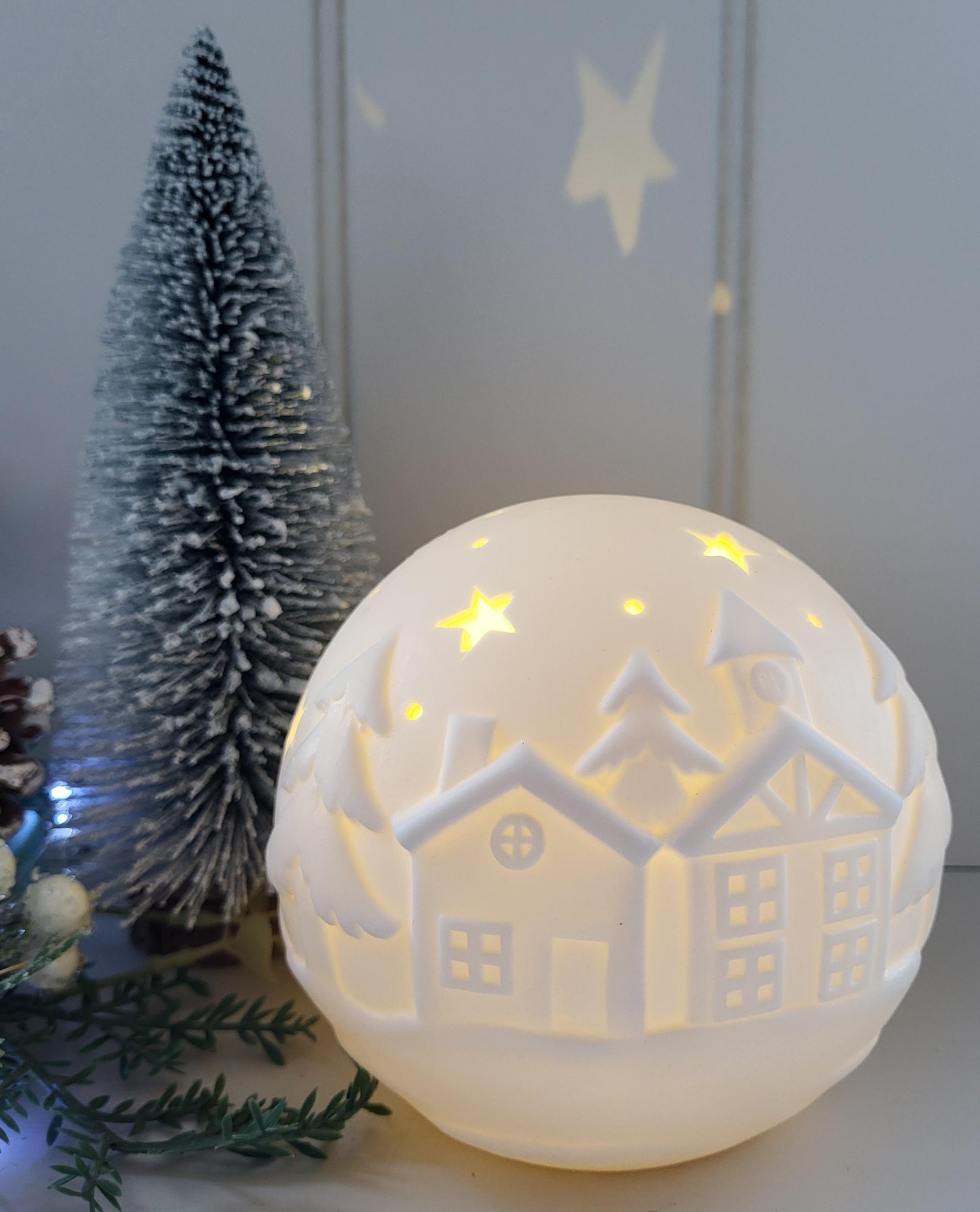 Add a touch of festive magic to your home with a matte White Embossed Ceramic LED Christmas Scene Ball Ornament. These charming pieces feature a beautifully embossed Christmas scene with trees, a cosy house, stars, and snow. The LED light inside brings the whole scene to life, casting a warm glow that’s perfect for creating a cosy atmosphere during the holidays. Two sizes available .