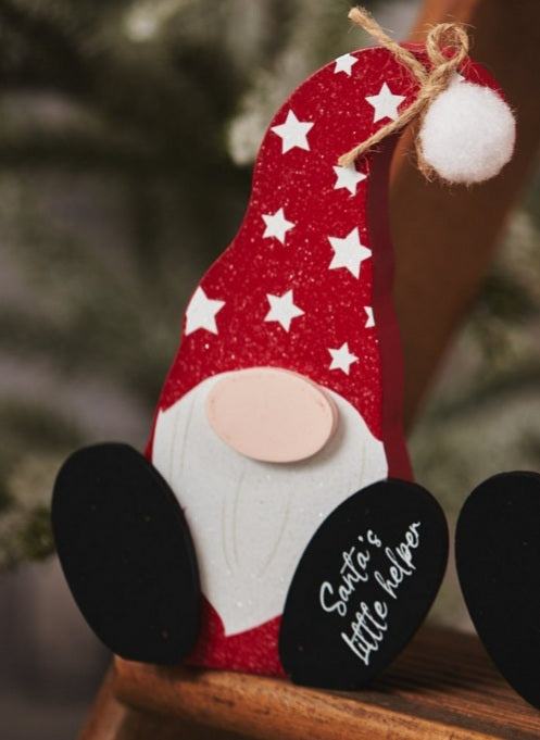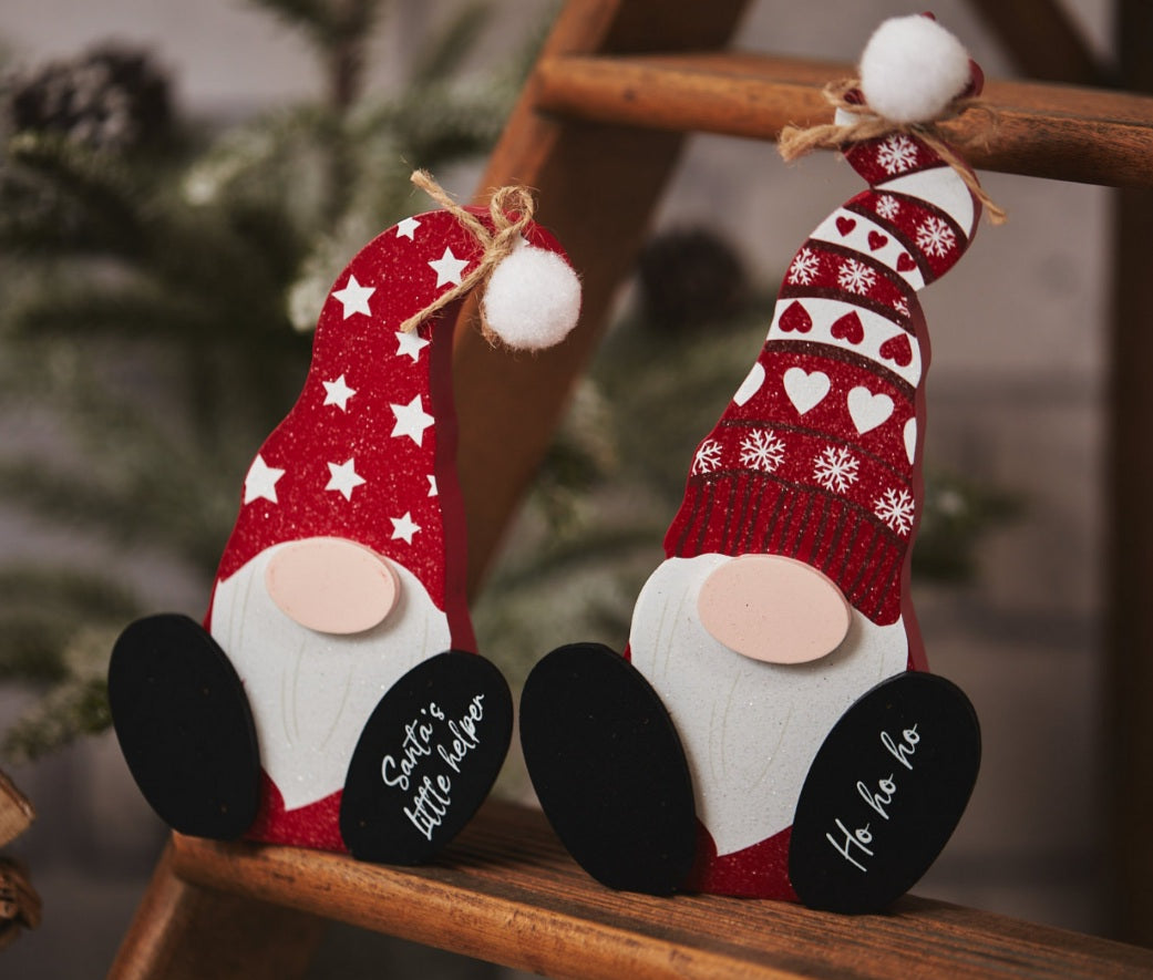 These gorgeous painted wooden gonks decorated with red and white stars or hearts in festive colours and 'HO,HO ,HO ' or 'Santas Little Helper' painted on the feet and fluffy pom poms adorning their sparkly hats.