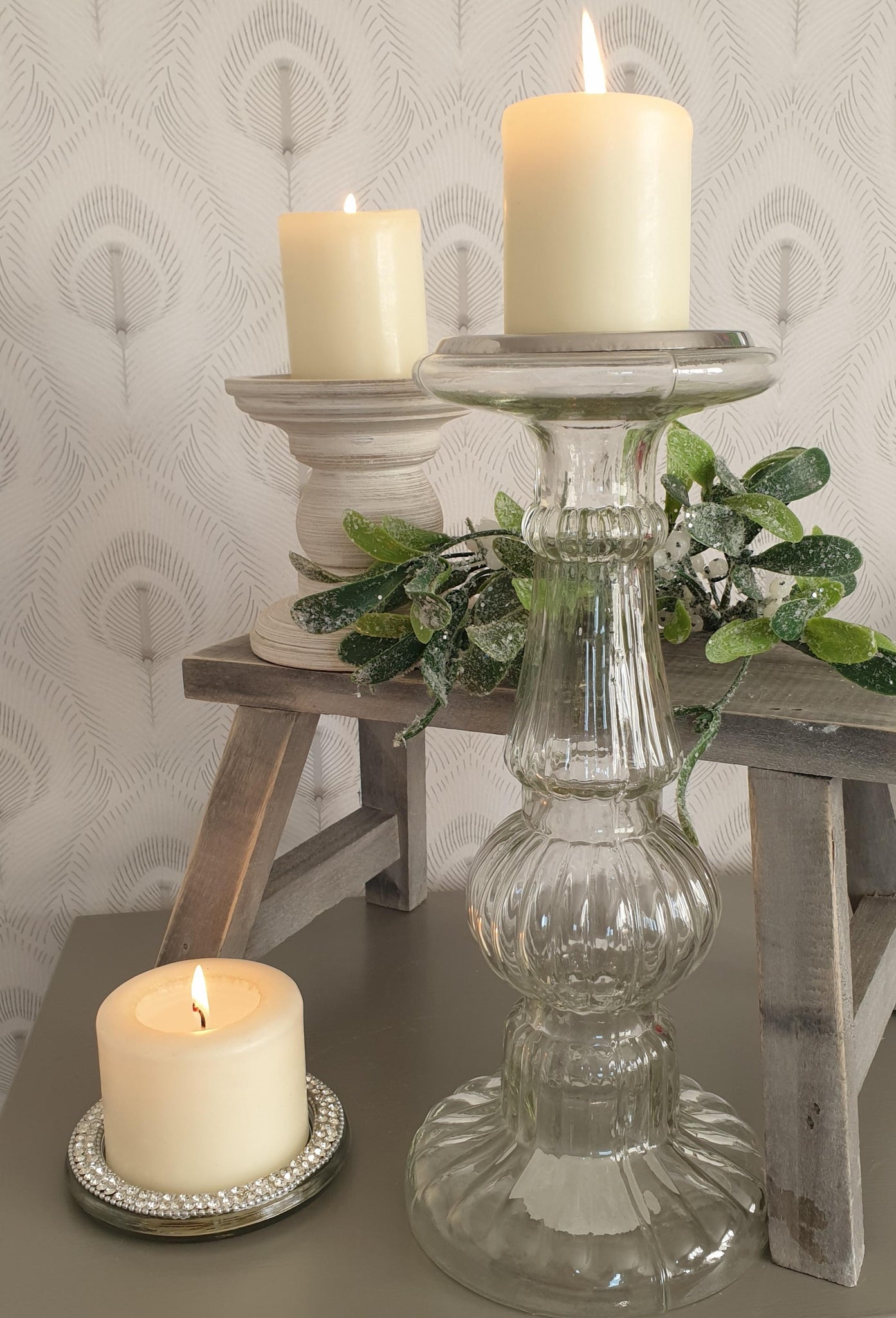 Stunning handmade glass plate edged in diamanté to hold a pillar candle. Would look fabulous on any table display. A touch of bling !!