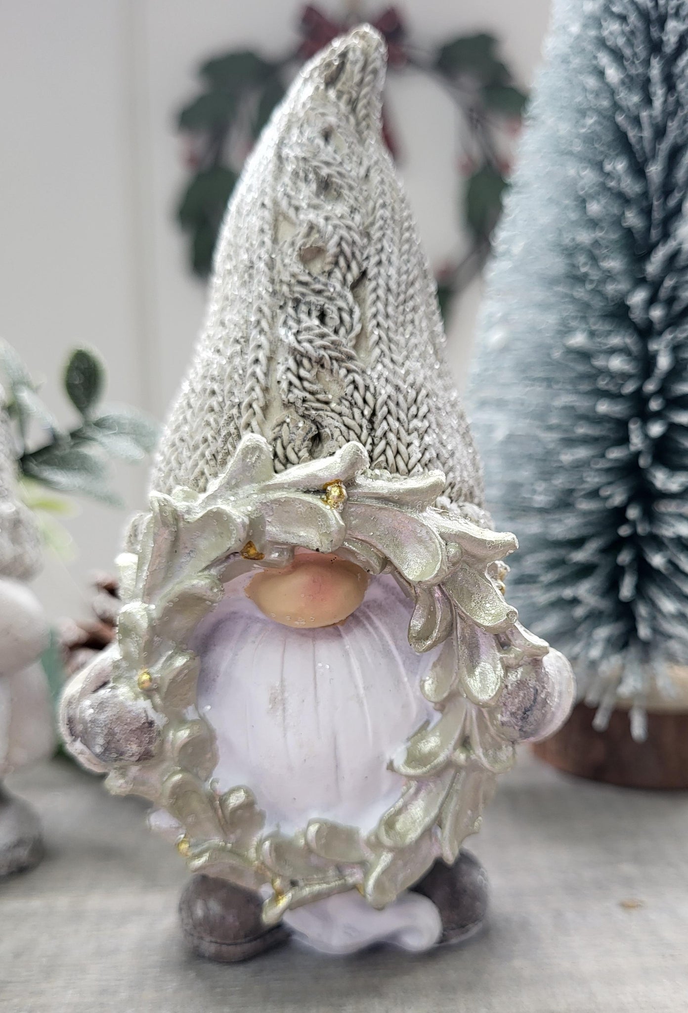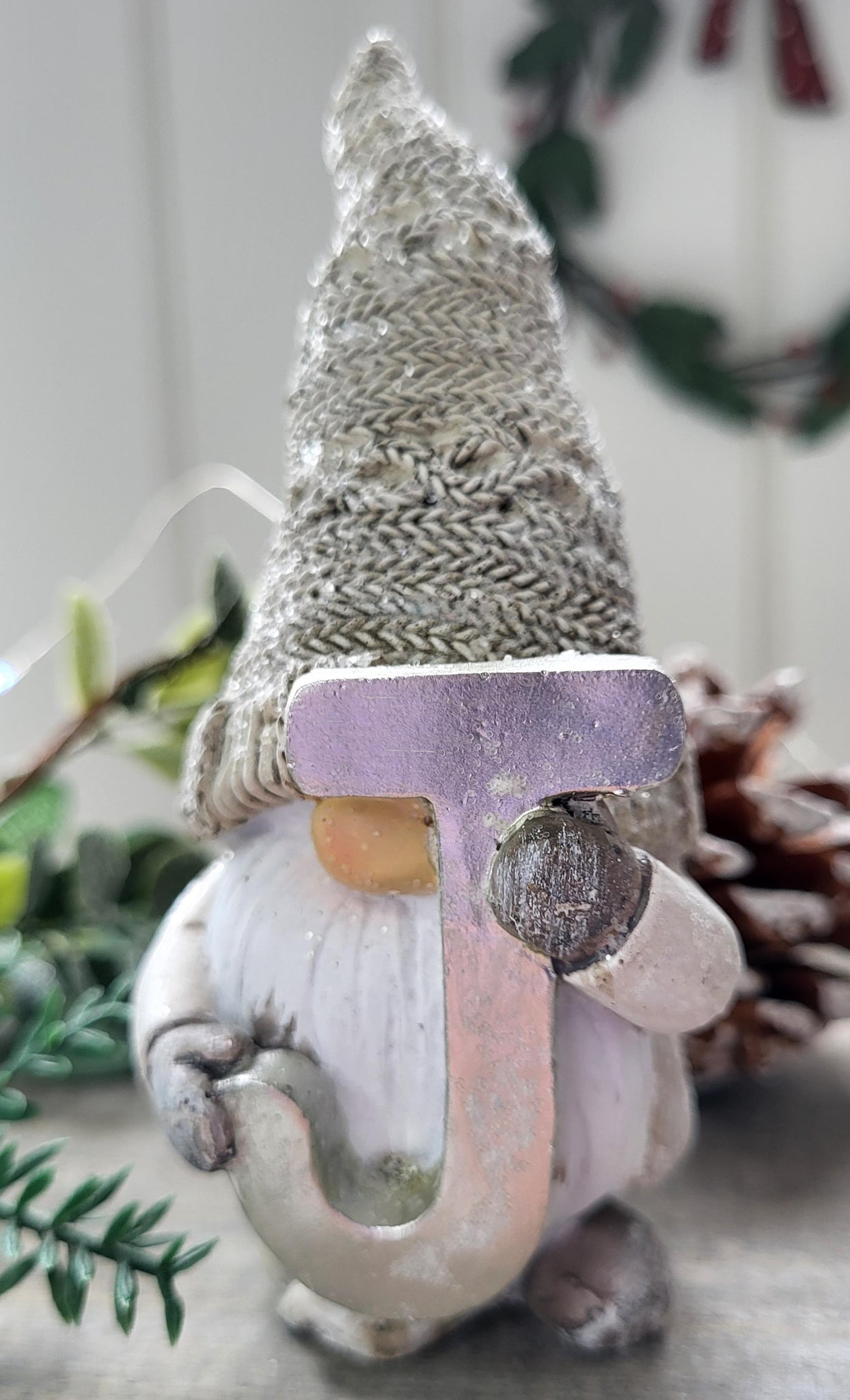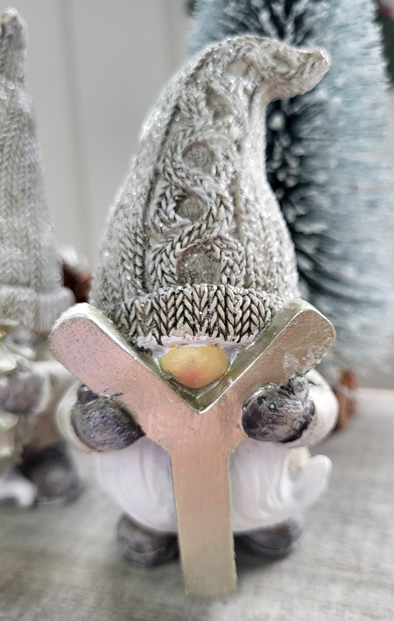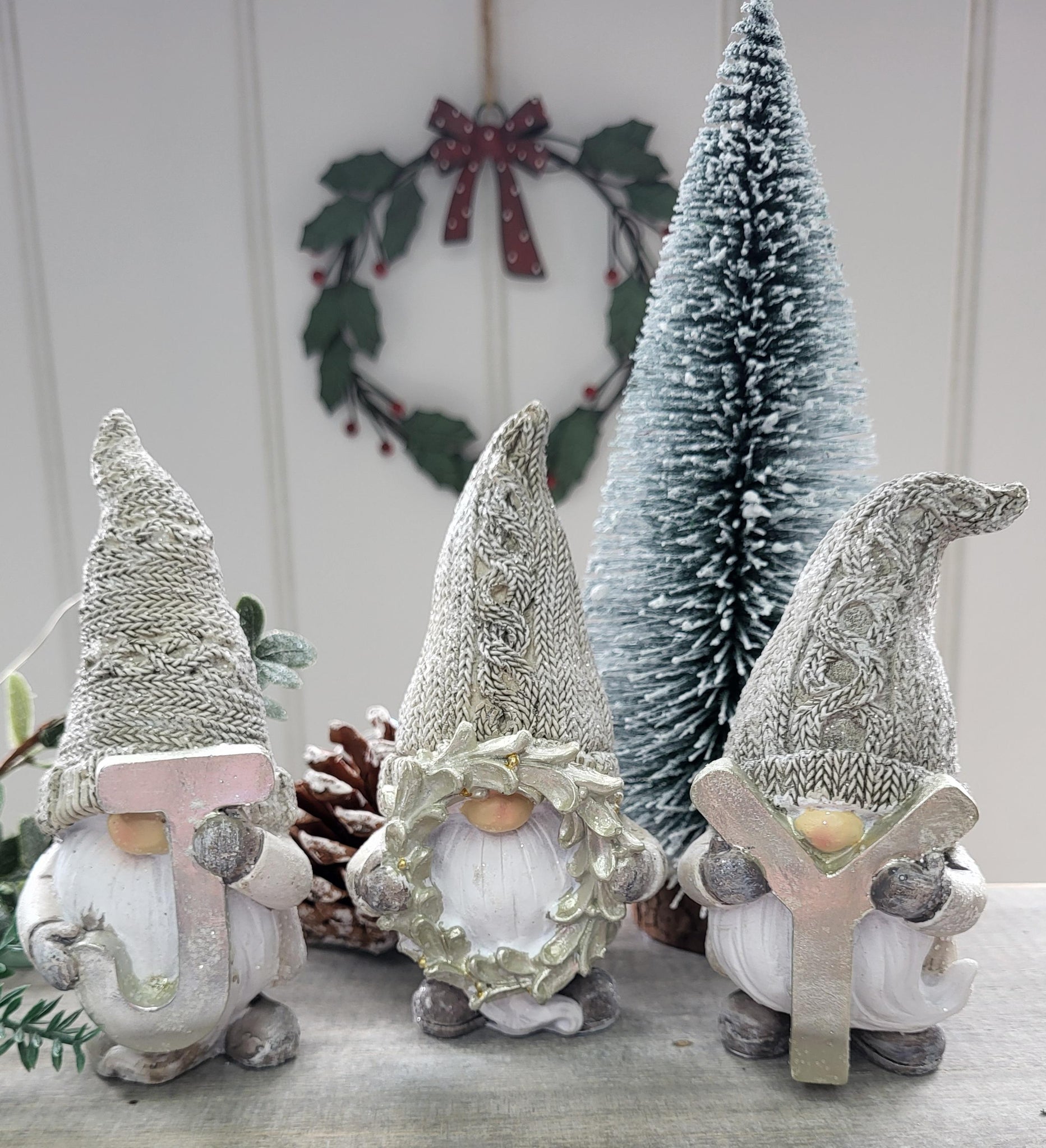 Set of 3 cute gonk figures with grey 'knitted' hats each one holding a silver letter spelling the word JOY - the O being a silver wreath and all topped off with some added sparkle.