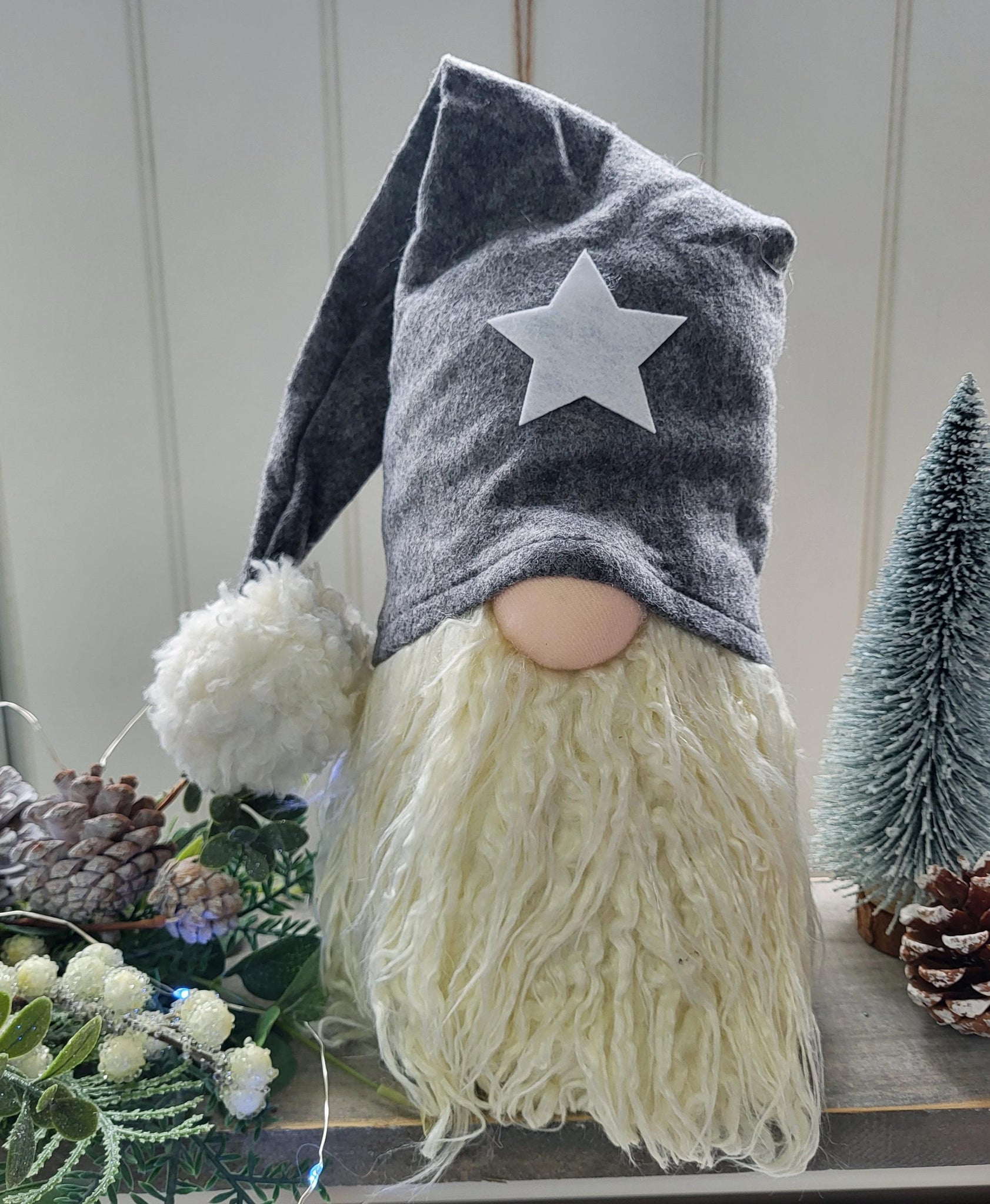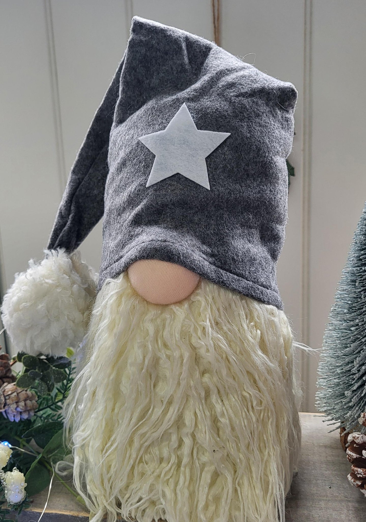 A large gonk doorstop with a big grey fuzzy Pom Pom hat with a lovely star on the front. Great to bring out every Christmas or simply leave him all year !