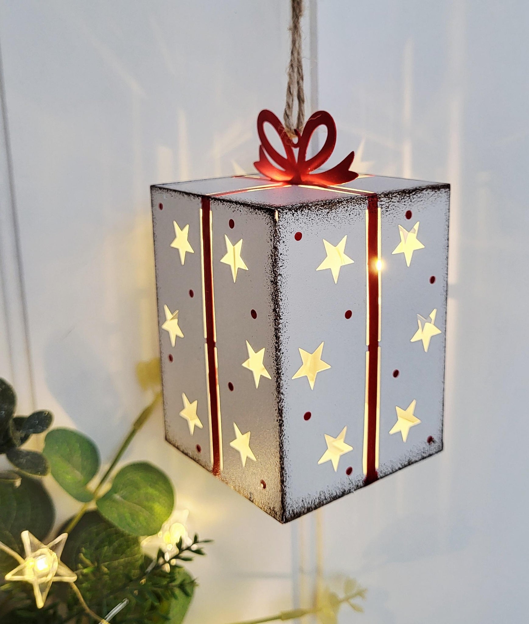 Adorable metal LED light up presents , in festive red or white with cut out stars which let the light shine through. A twine hanger means you can hang it on the tree.