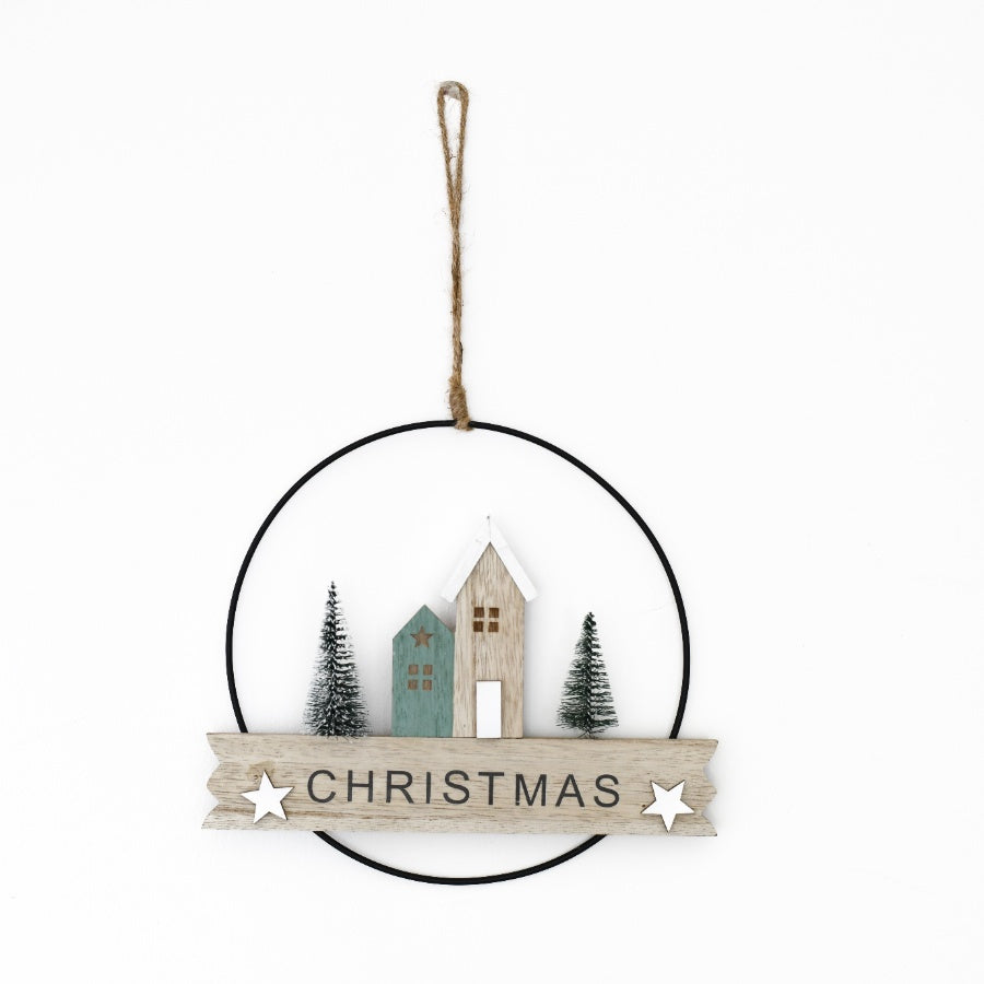 A simple metal framed wreath with wooden houses and fir trees and the word Christmas ,a great decoration for the festive season.