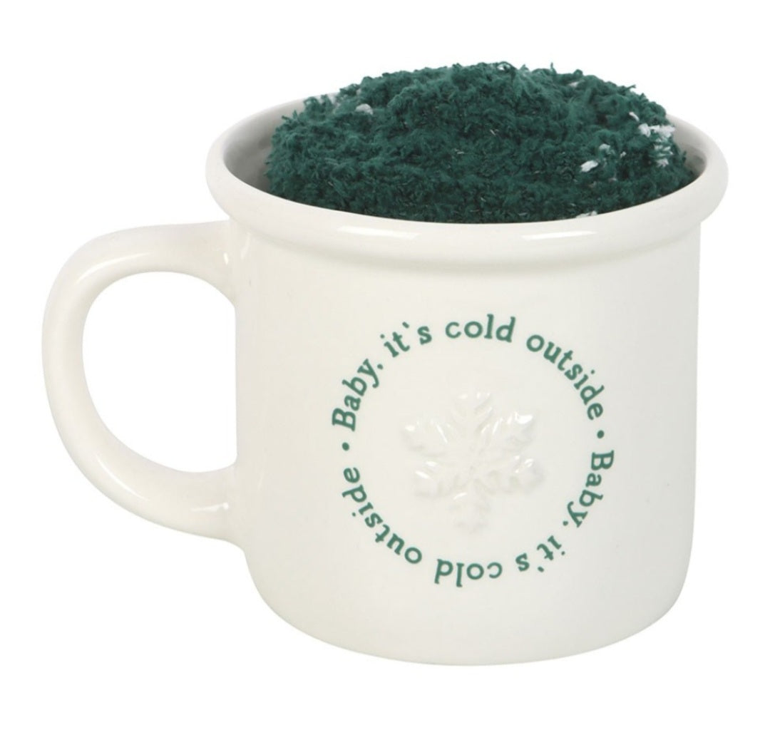 'Baby its Cold Outside' ceramic white mug with fluffy green bed socks to keep you cosy and decorated with snowflakes to match the mug emblem. Comes in a fab gift box.