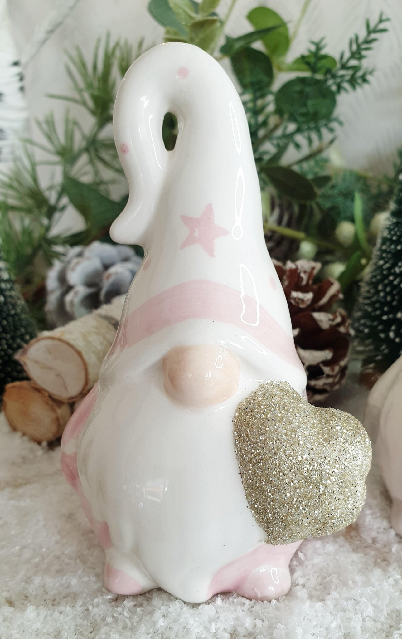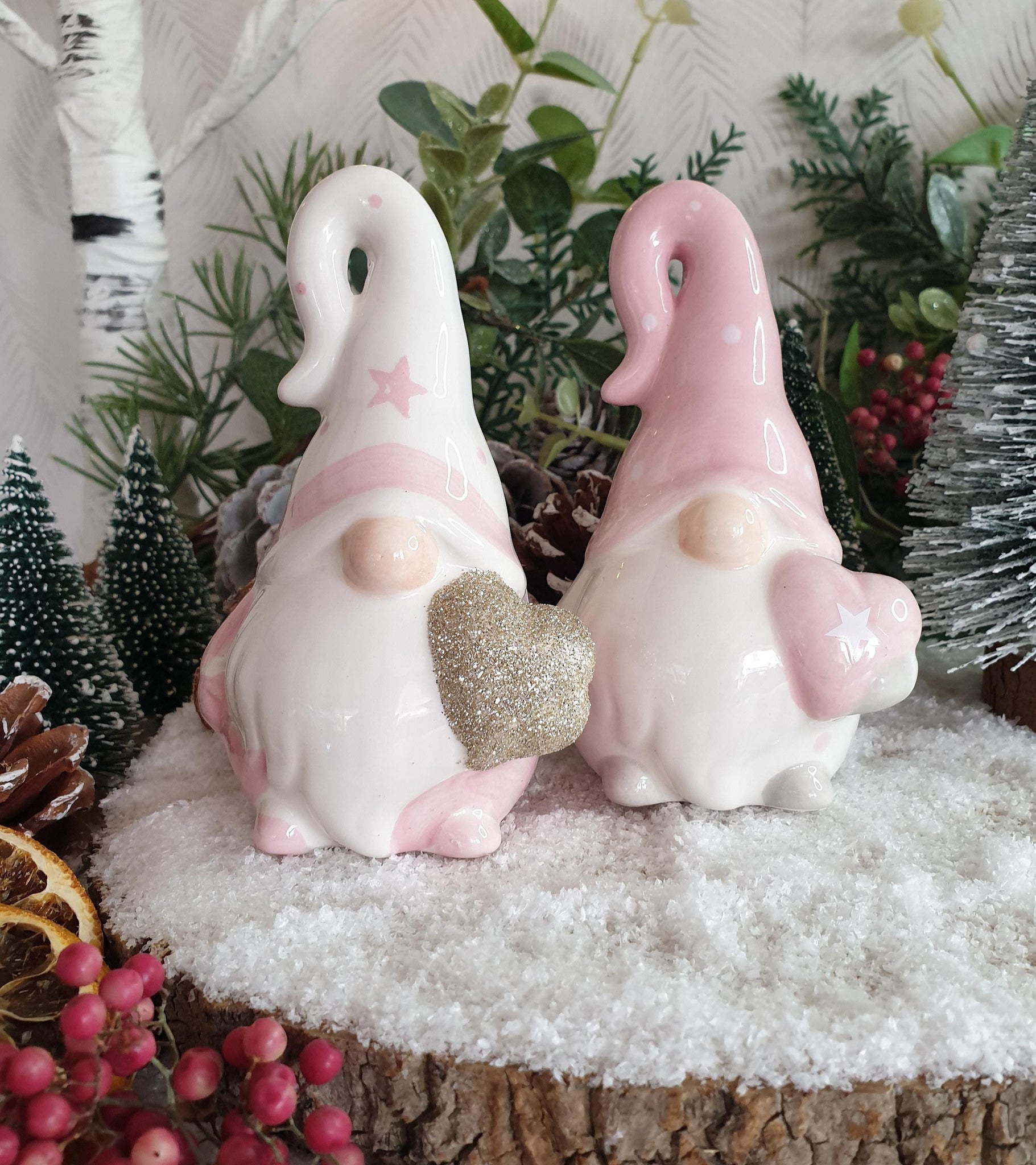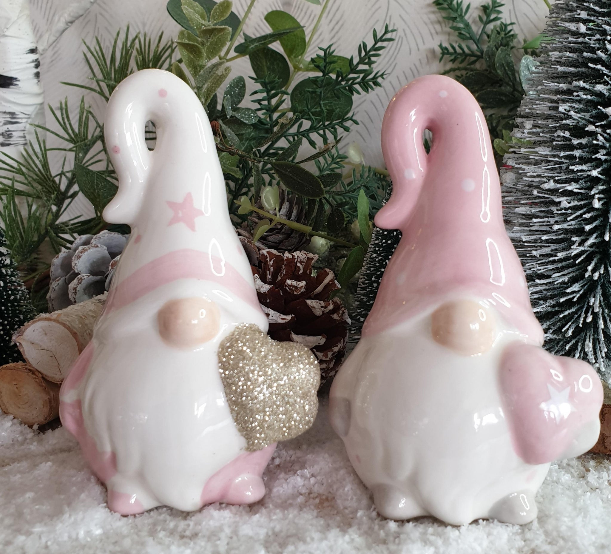 Gorgeous pink and white ceramic gonks holding hearts , one with gold glittery heart and one with pink heart, with a sprinkling of little white stars.