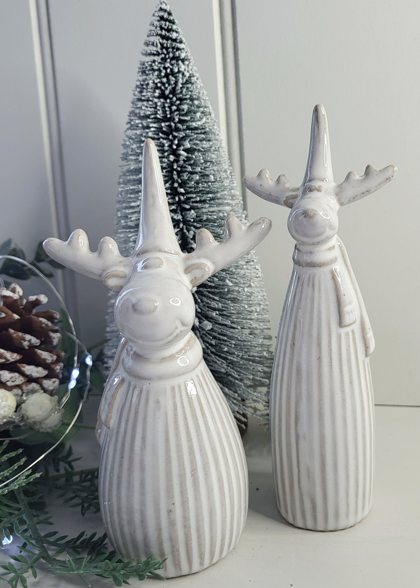 This pair of adorable glazed ceramic reindeer brothers would look good on any Christmas display...with their ridged bodies and pointy hats ,such fun. Price for pair.