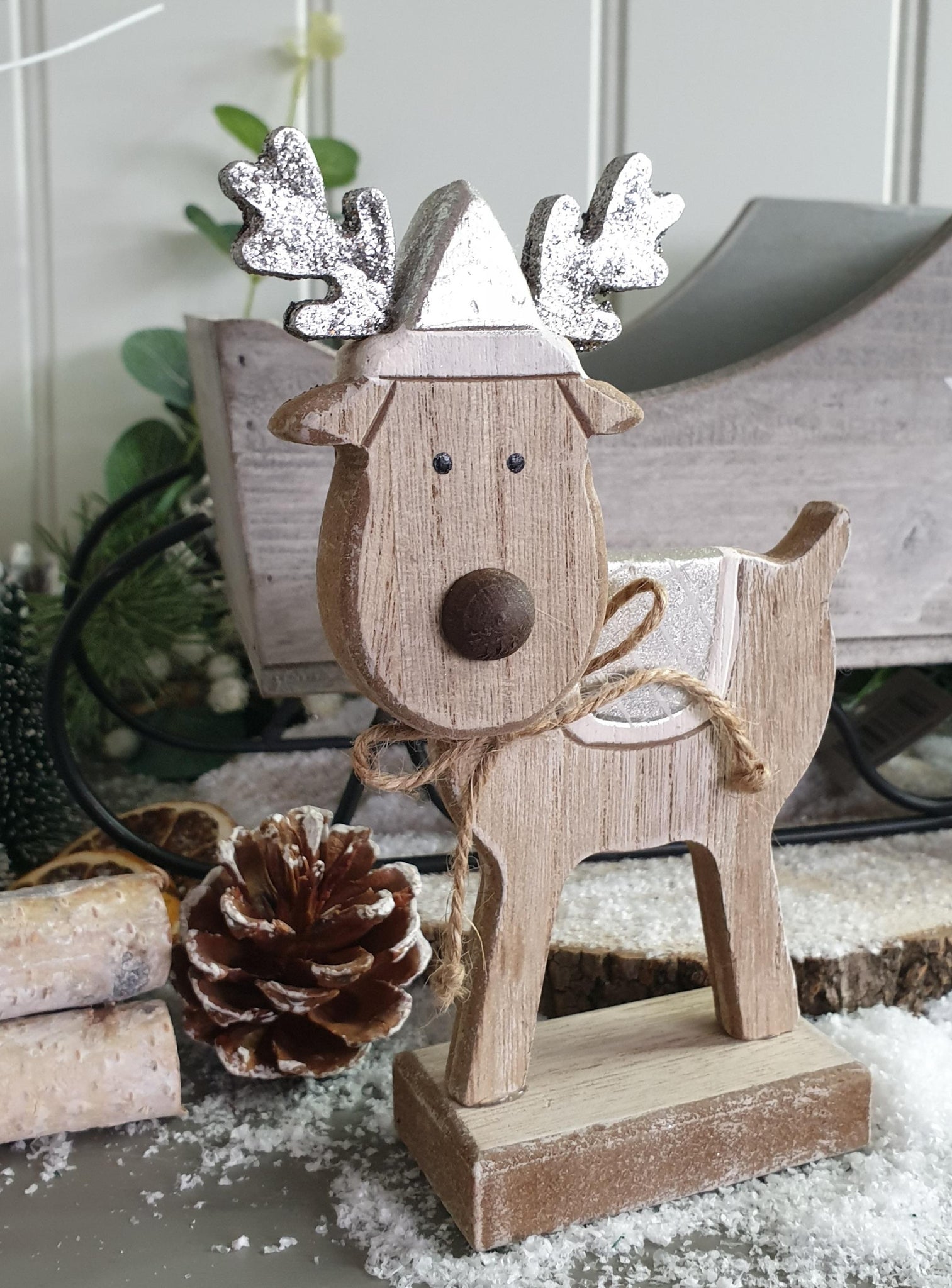 A cute wooden standing reindeer decoration with sparkly antlers, sweet button nose and a rustic touch , complete with twine bow.