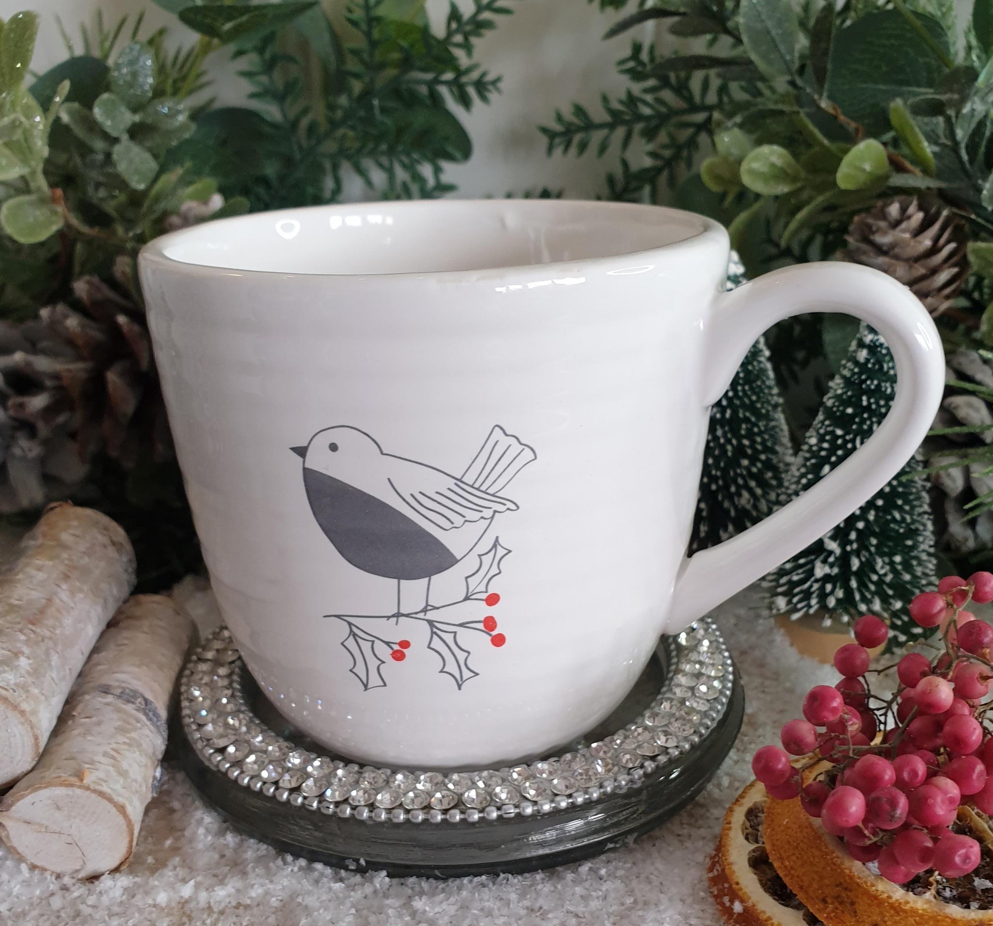 A gorgeous white ripple effect ceramic mug with a little grey robin depicted sitting on a holly branch with sweet red berries ,to match.
