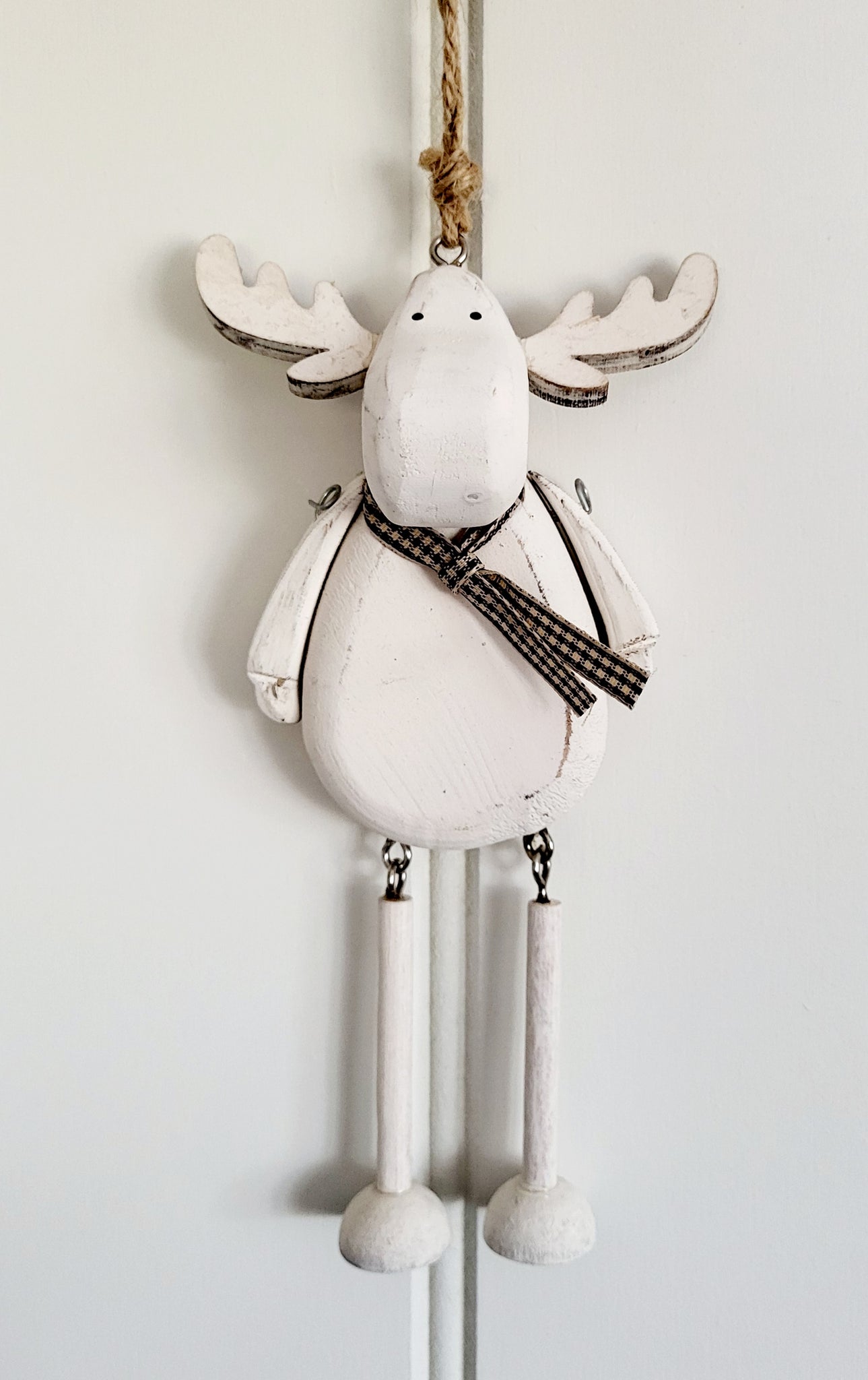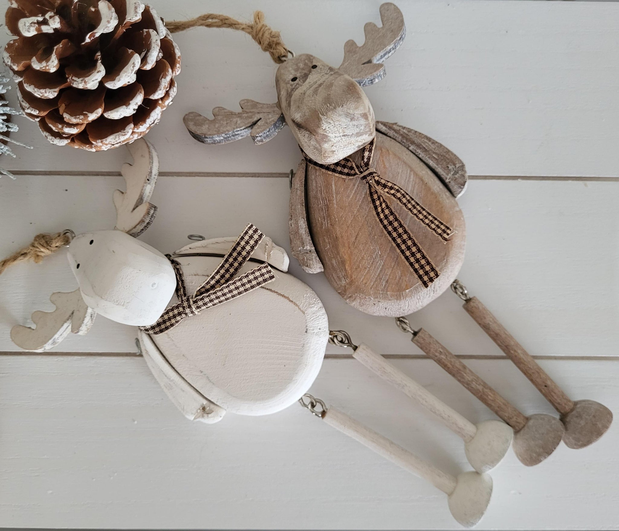 A mix of 2 colours of these adorable rustic wooden reindeer hangers - white or natural complete with their gingham scarfs ,their distressed finish and dangly legs makes them such fun.