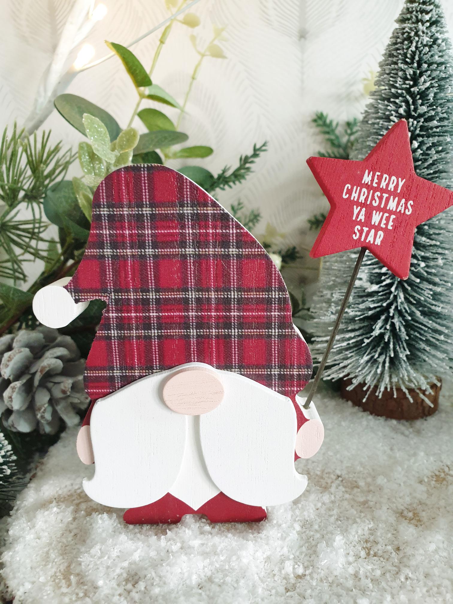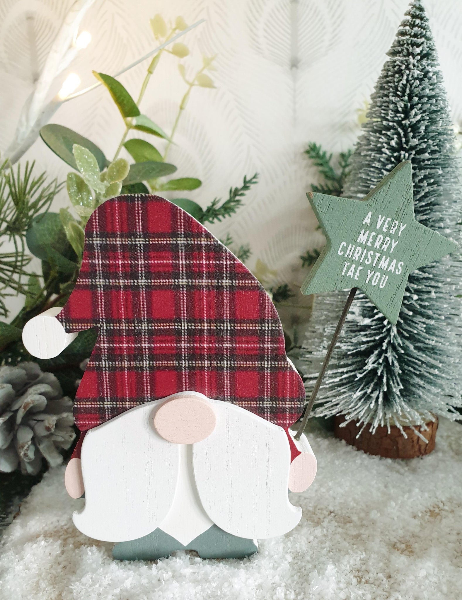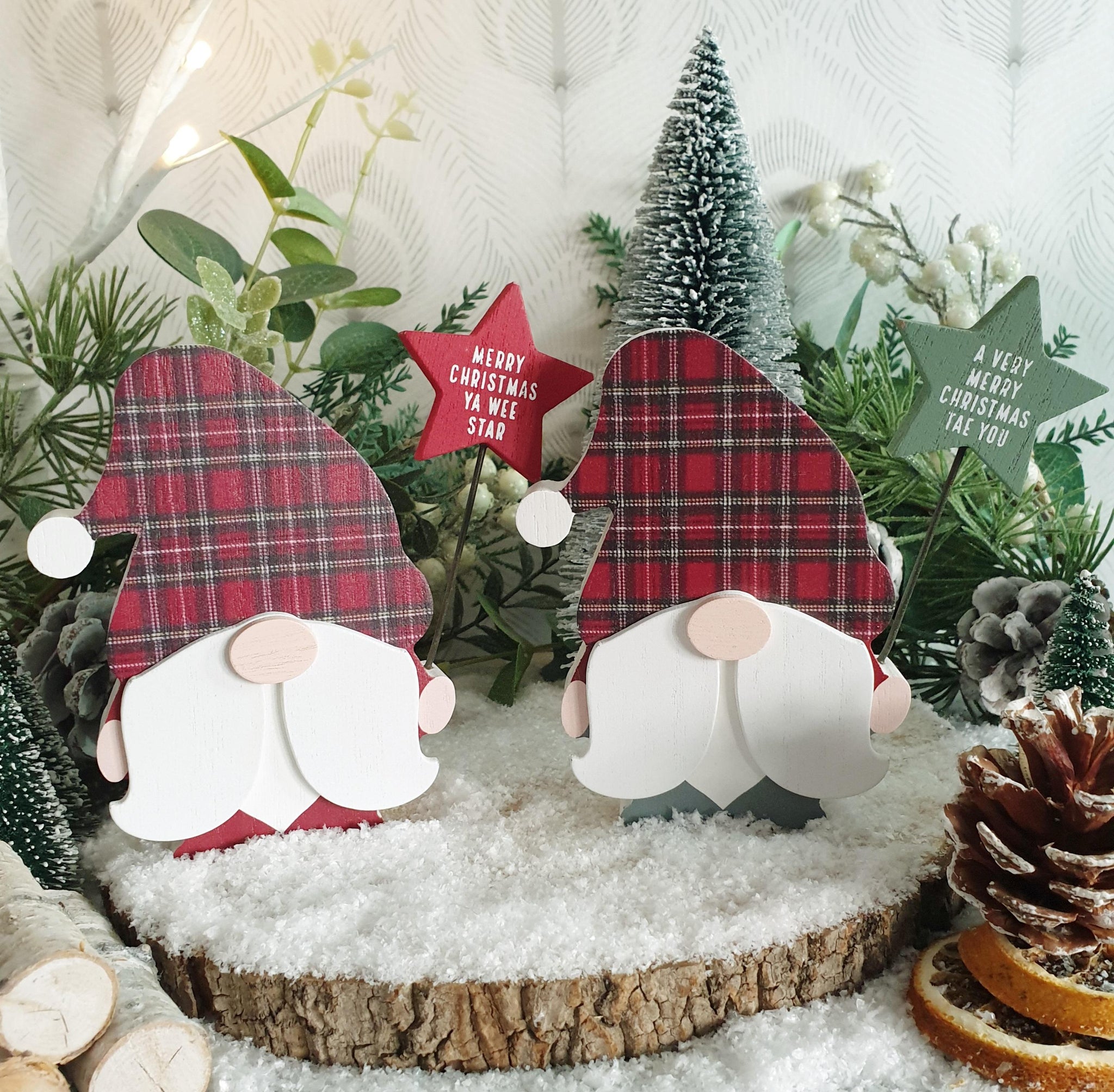 Look how sweet these Scottish wooden gonk blocks are with their tartan hats and long beards holding their star balloon, in red or green . Red says 'Merry Christmas Ya Wee Star' and the green says 'A very merry christmas tae you' .