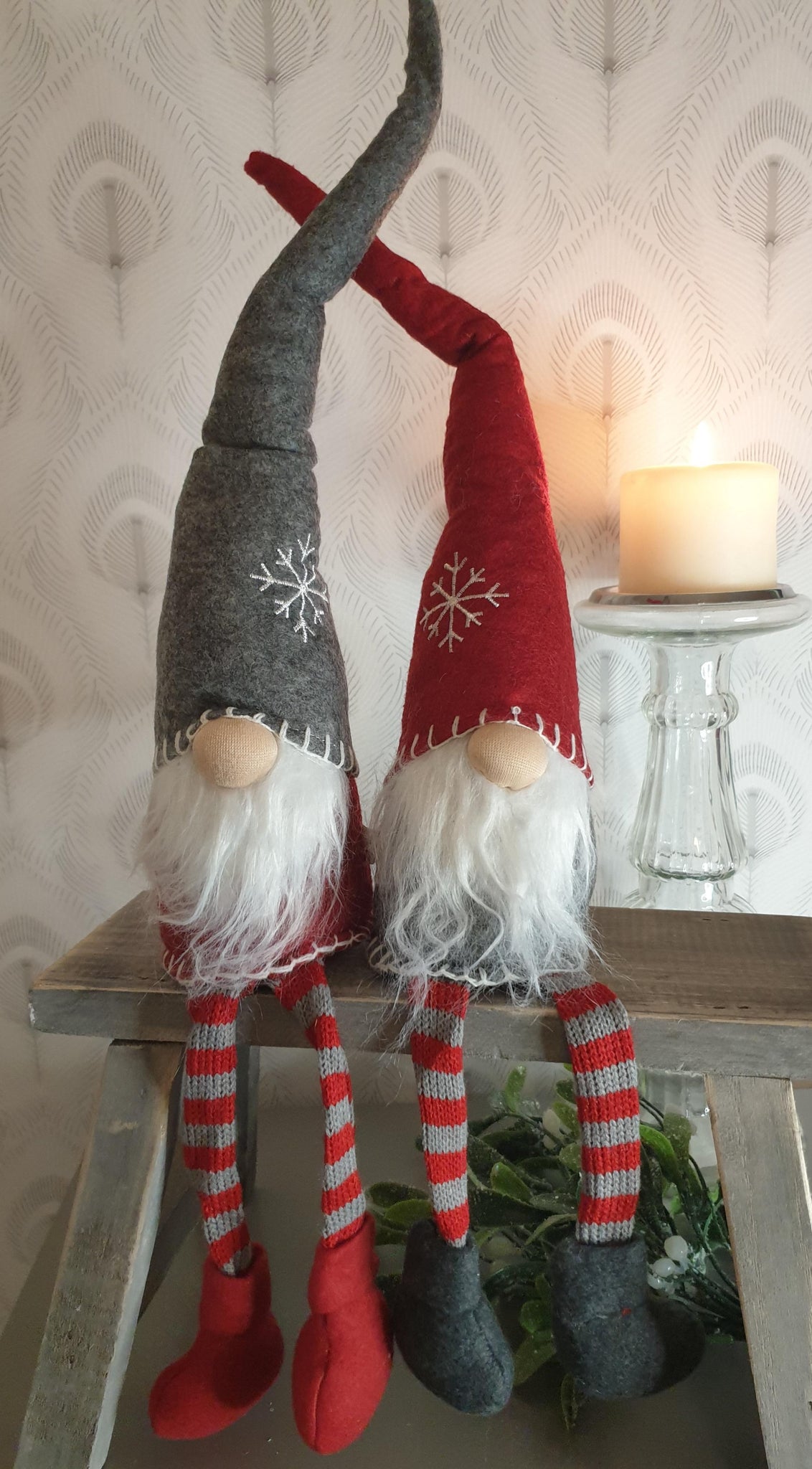 Festive red or grey long stripey legged sitting gonks. With their fabulous long pointy hats decorated with a snowflake.
