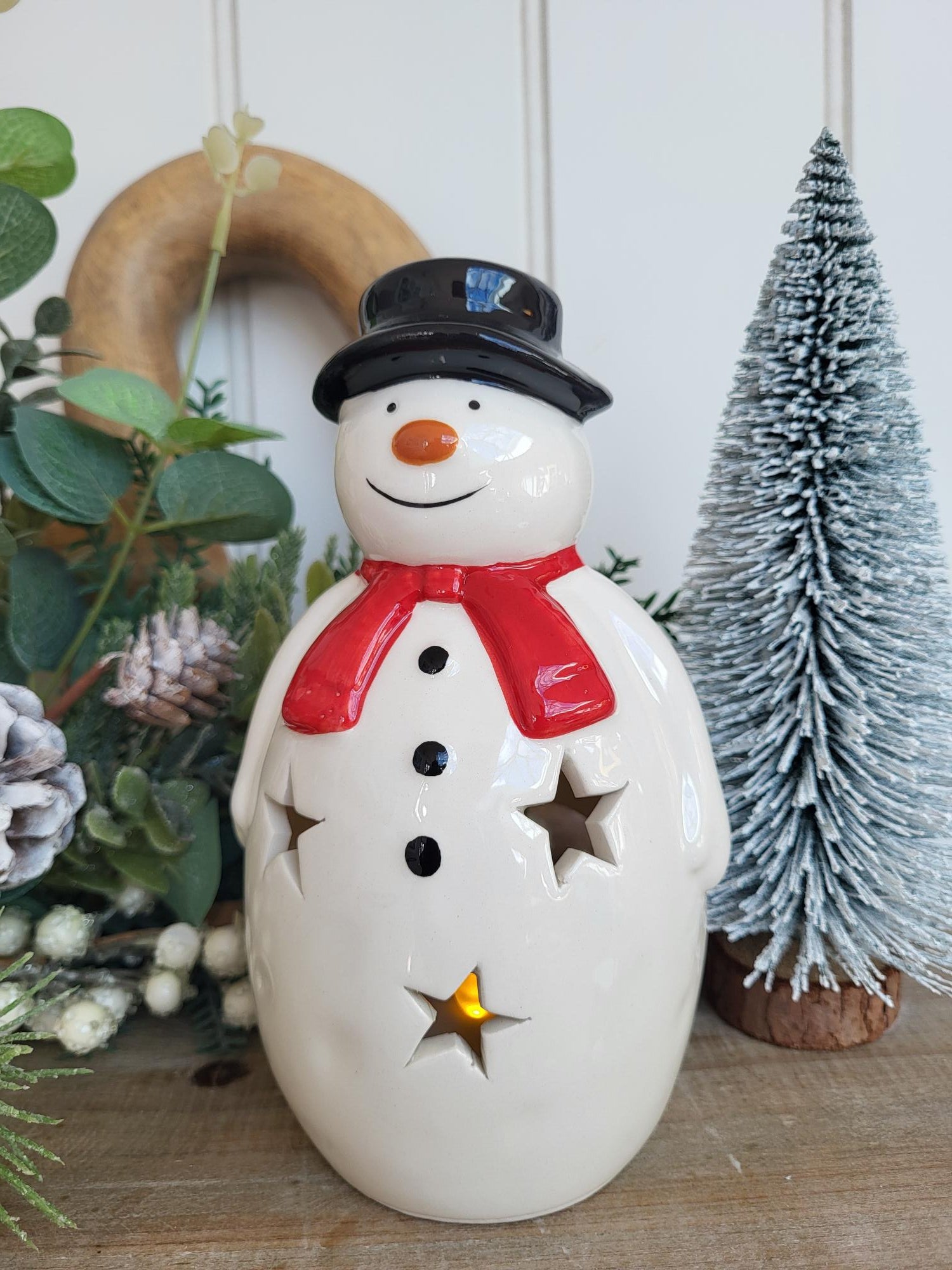 These gorgeous ceramic snowmen figures remind me so much of the famous 'Snowman' flying through the air! With their shiny black hats, bright red scarves and shiny nose ,place a tea light in the back and see the light through the cut out stars - sure to make any space look festive.