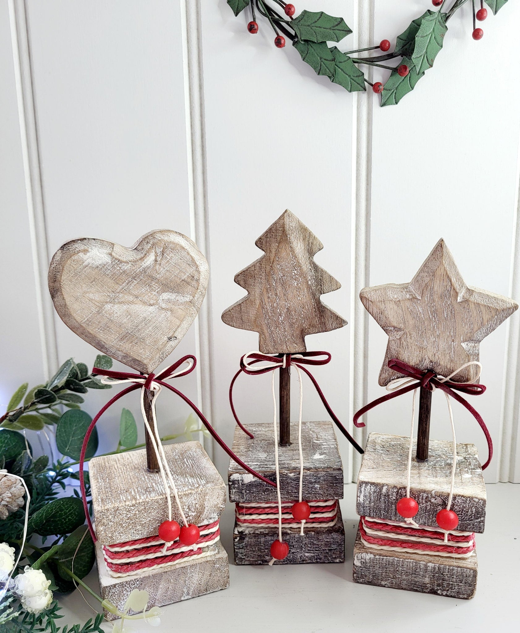 These sweet wooden ornaments bring a rustic charm to Christmas decor . A Heart , Tree or Star shape with festive coloured twine and cute beads to decorate.