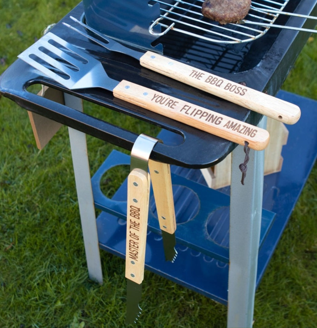 This fantastic wooden grilling set includes all the tools needed to throw a sizzling barbecue (minus the burgers). The set includes a stainless steel spatula , grilling fork and pair of tongs with wooden handles and string for hanging. Text reads on the spatula - 'You're flipping amazing' - on the tongs 'Master of the BBQ' and on the fork 'The BBQ Boss' - making this set ideal for a Fathers day/ Man gift.