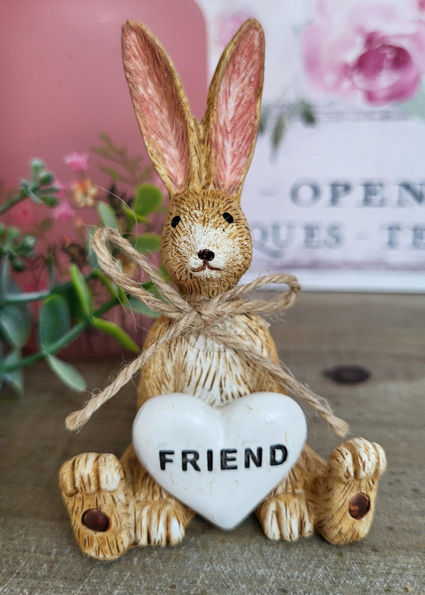 A charming choice of bunny figure sitting holding a white heart with the word Friend , Love or Mum. The perfect gift for that special someone.