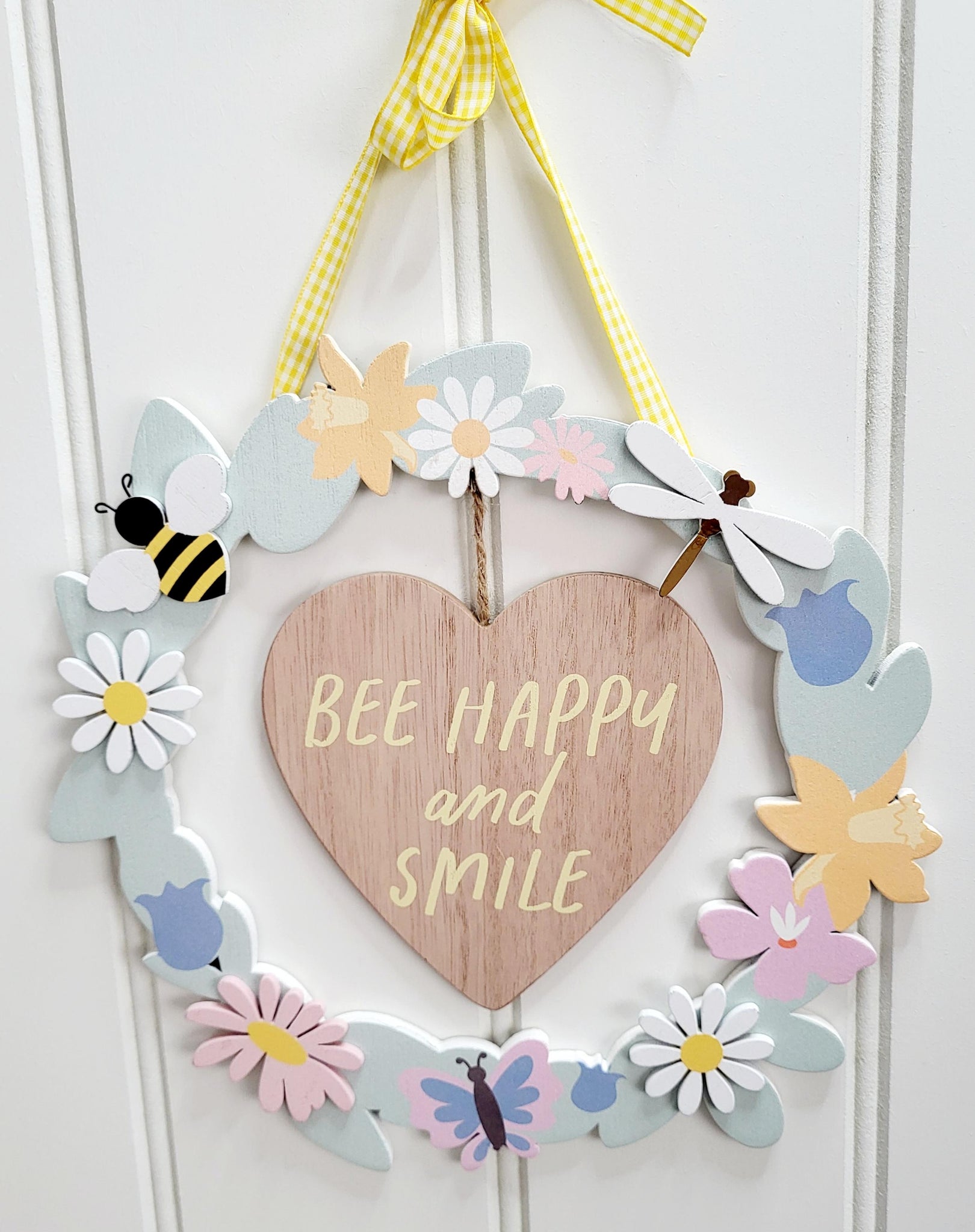 A beautiful painted floral wooden plaque in a wreath shape with brightly coloured flowers , bee , butterfly and dragon fly design with a hanging heart in the middle saying 'Bee Happy and Smile' with a yellow gingham checked hanging ribbon.