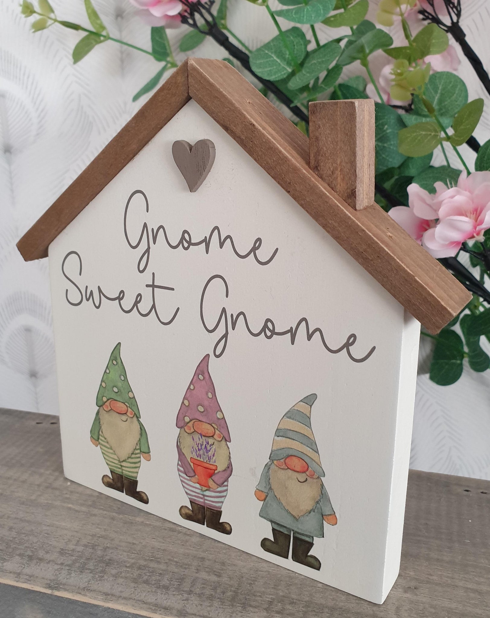 An adorable cream painted wooden house shaped plaque decorated with 3 pastel coloured Gnomes in wellies and a heart and the words 'Gnome Sweet Gnome '. Such a cute gift for a home.