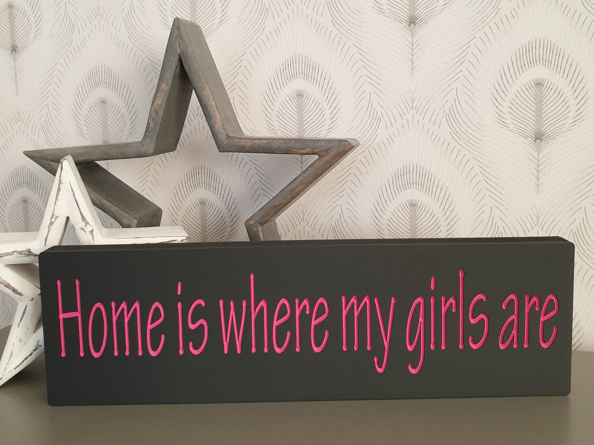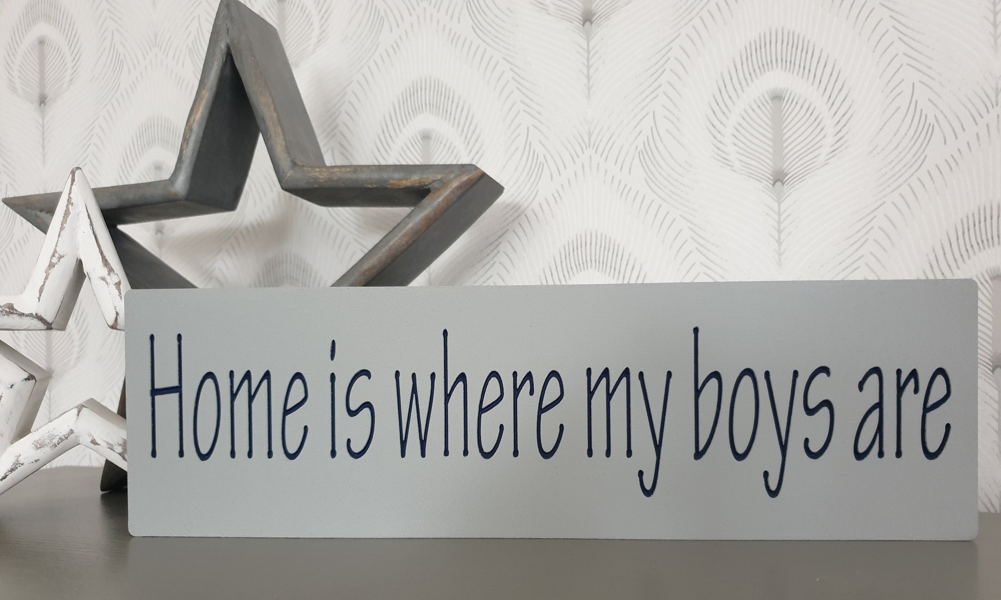 Hand painted by me, solid wooden plaque with quote 'Home is where my boys/girls are"- Picture showing navy writing and pale grey background for boys and various colour ways for girls.