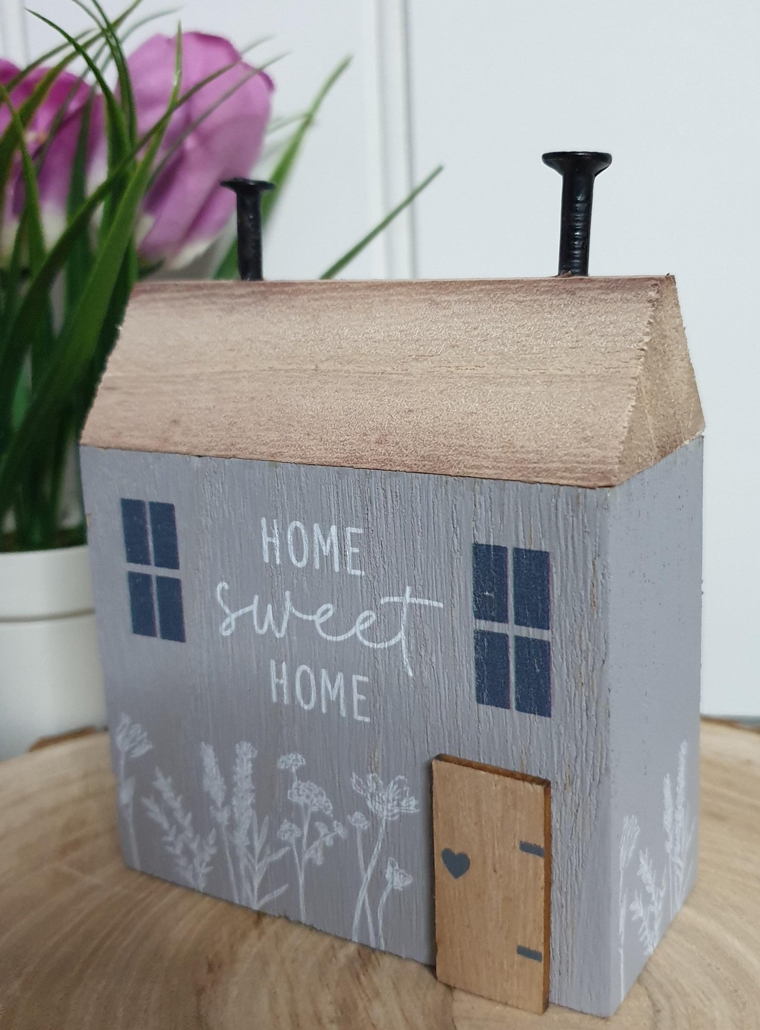 A gorgeous wooden house block painted grey with natural wood roof, cute white floral detailing and 'Home Sweet Home ' printed on the front....cute chimney's finish the roof.