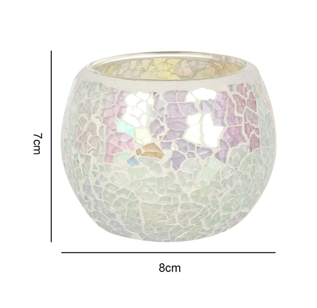 Beautiful sparkling crackle effect glass tea light holders in two sizes , large and small with an iridescent finish these really shine in rainbow colours.