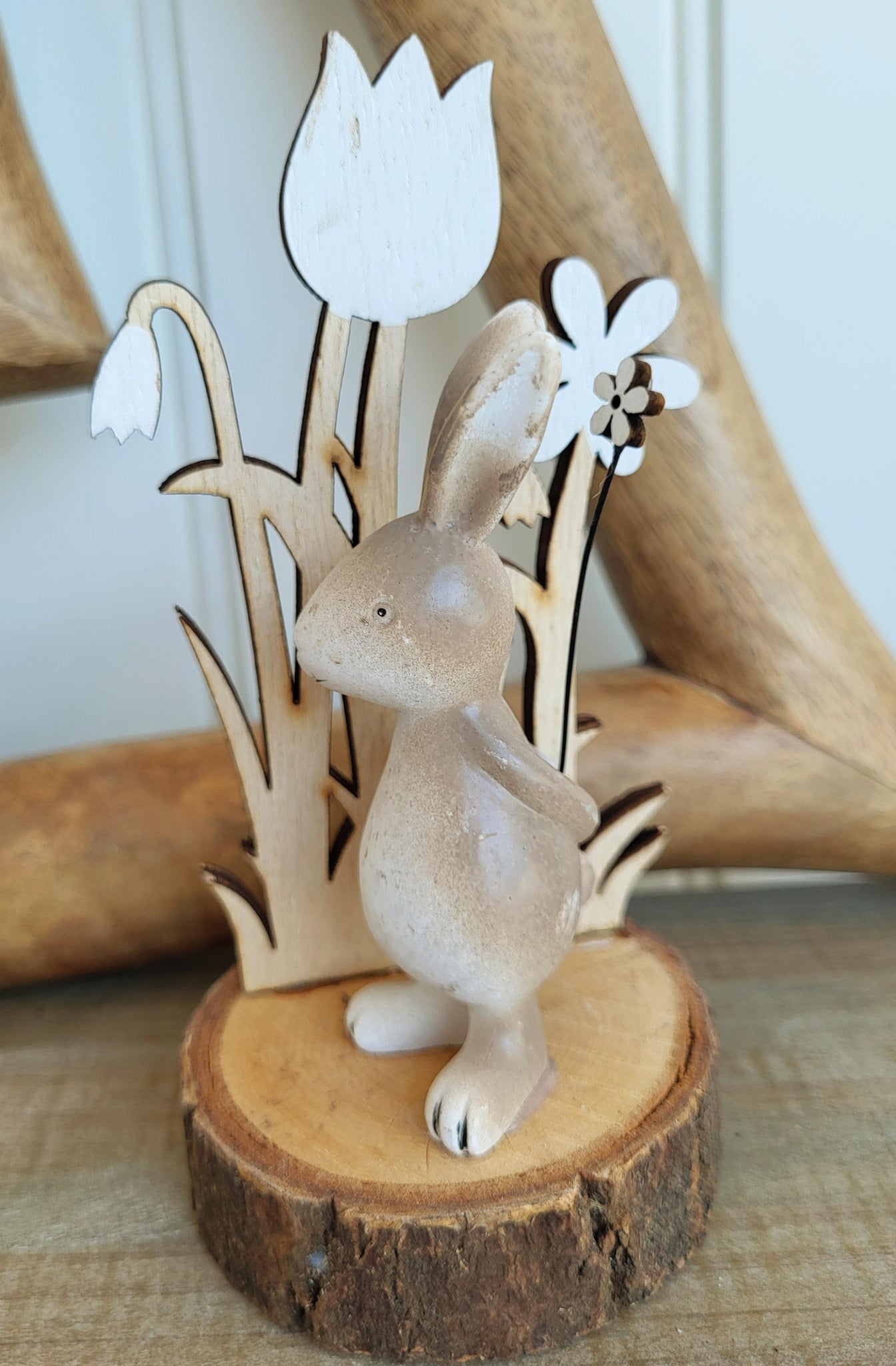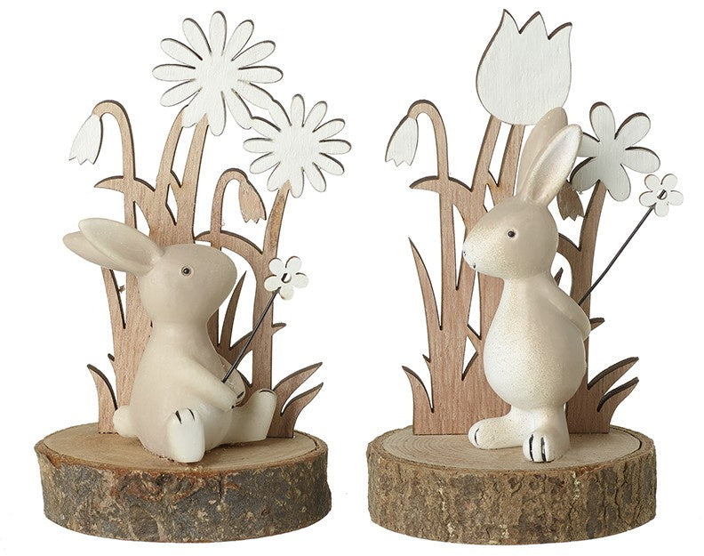 These log slices are decorated in a springtime floral bunny scene with pretty wooden flowers behind the bunny who is holding a flower stem. One bunny sitting and one standing.
