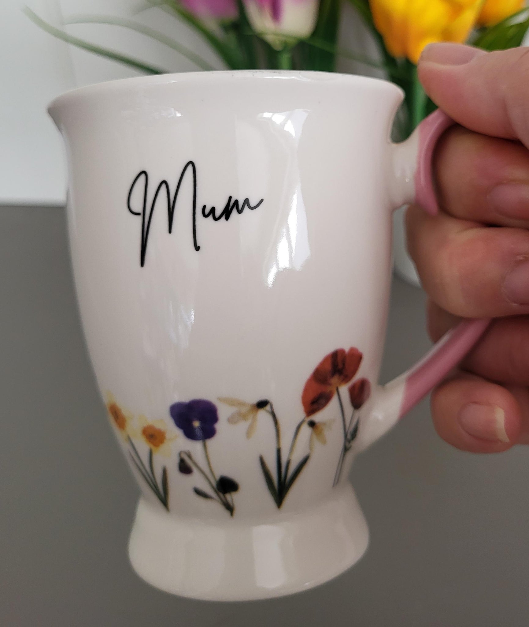 Taking inspiration from vibrant British wildflowers like Daisies, Violets, Snowdrops, and Poppies, this charming ceramic mug stands on a footed pedestal and showcases an exquisite design. Its graceful curved handle, in a soft shade of pale pink, beautifully complements the captivating pattern. The delicate script font elegantly displays the word 'Mum,' making it an ideal present for that extraordinary individual, while also paying homage to the enchanting British countryside.