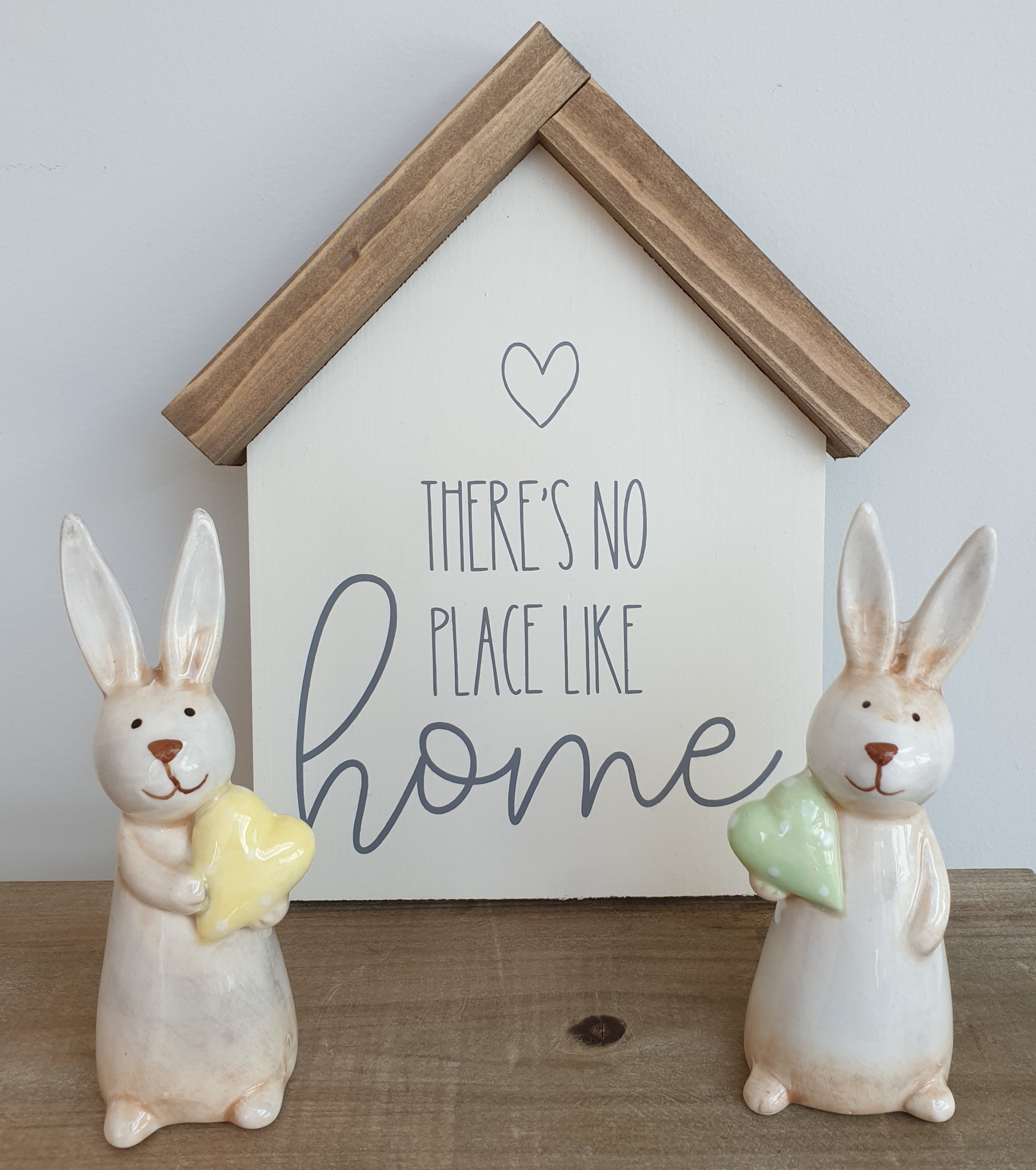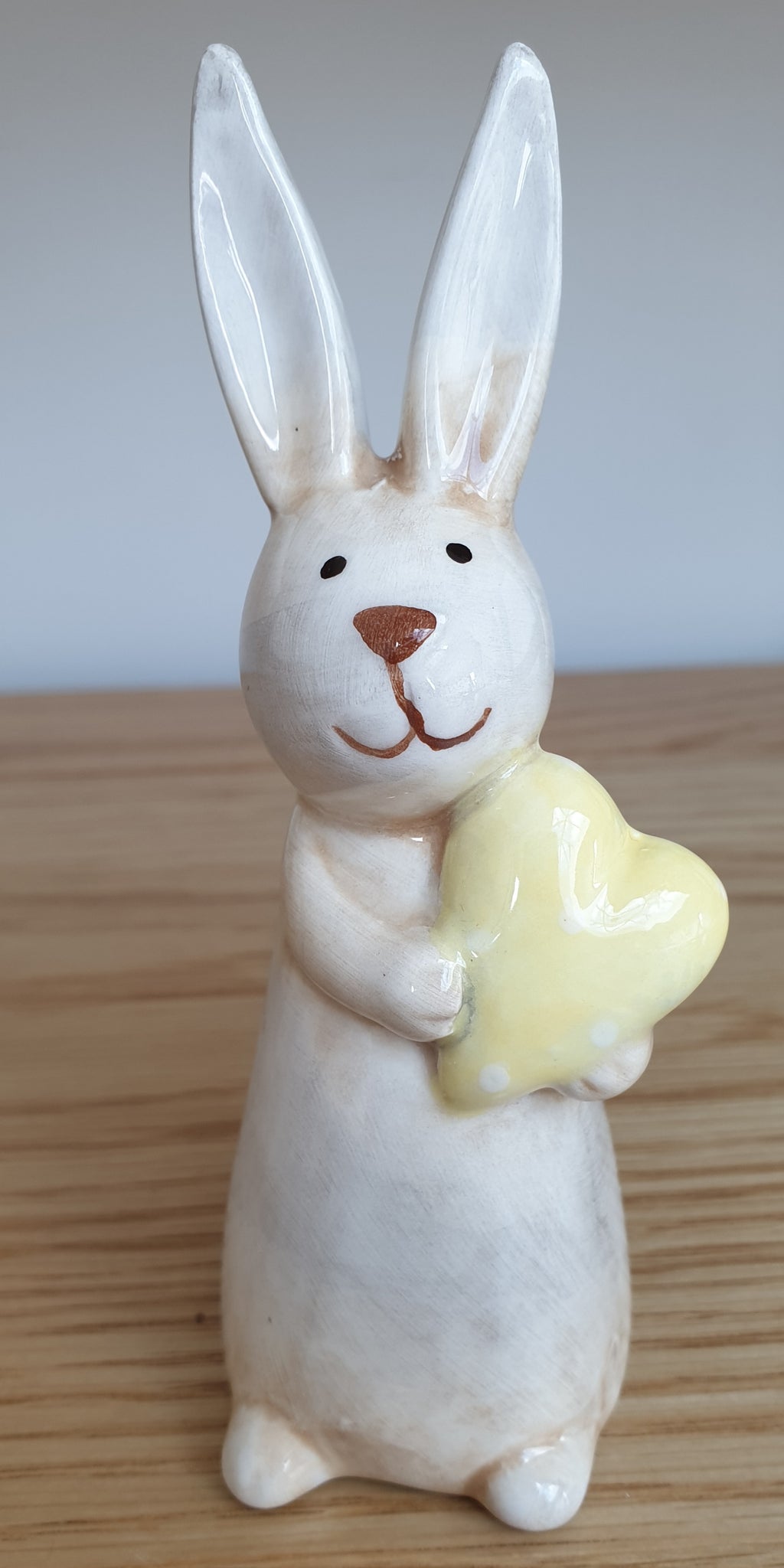 A cute standing ceramic light beige bunny ornament holding a polka dot heart in yellow or green. Great for an easter or spring display , perfect for a sweet decoration for the home.