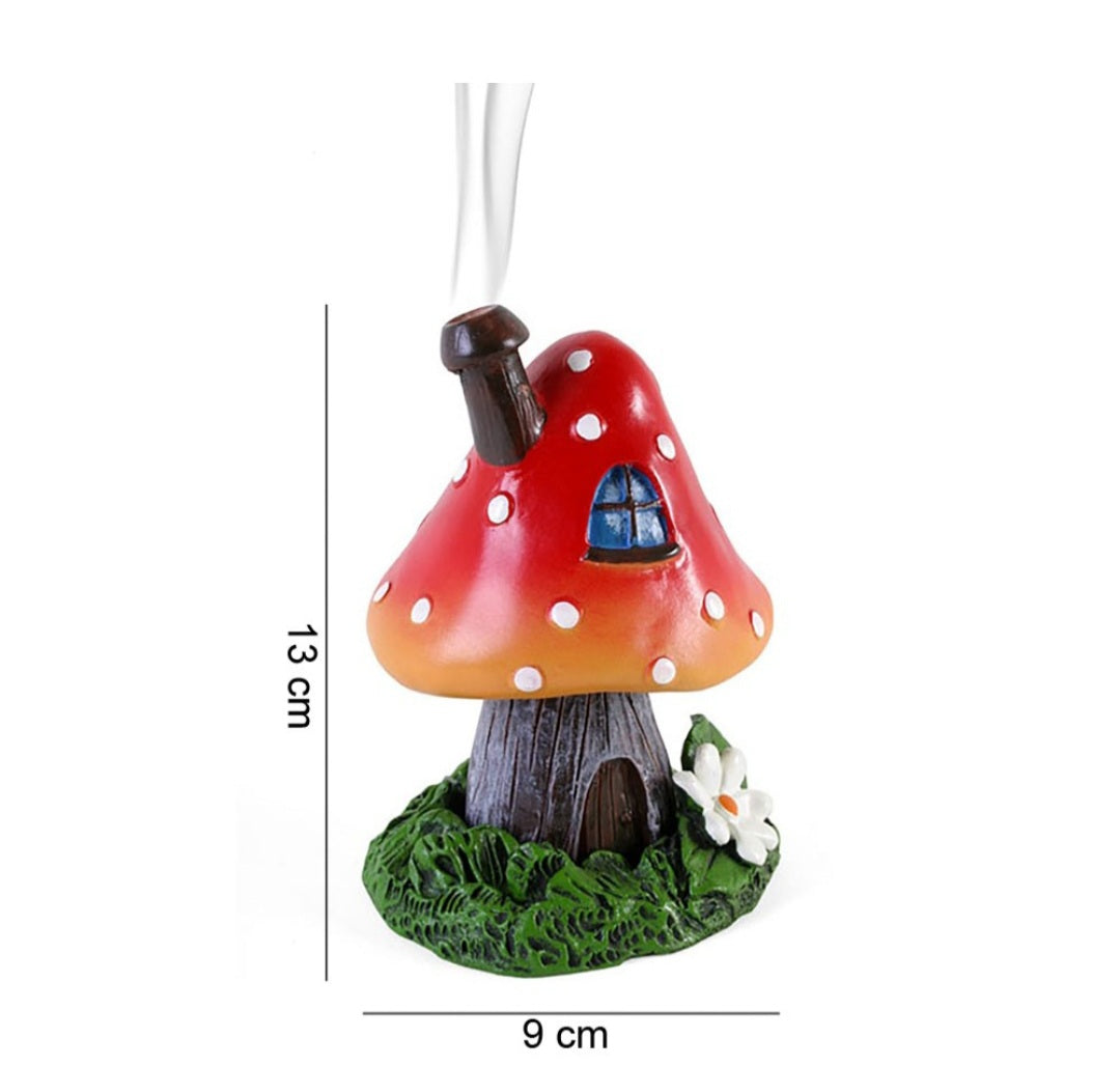 A bright red toadstool house design incense cone burner. Intricate detail. When the cone is burning, the smoke rises through the chimney of the item. Great for burning Citronella to keep the flies away while eating outside .