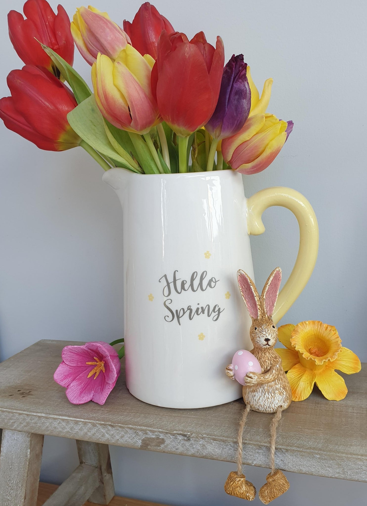 A beautiful white ceramic jug vase with a pastel yellow handle and the words 'Hello Spring' and little yellow flower pattern around them.
