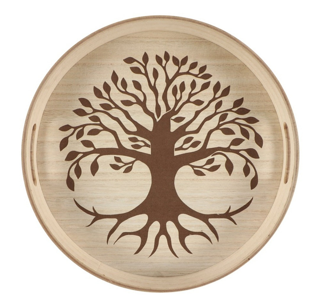A 35cm wooden serving tray featuring a contrasting Tree of Life silhouette engraved on the bottom and cutout handles for easy carrying. This full, leafy tree with outstretched roots is a popular spiritual symbol used in cultures around the world.