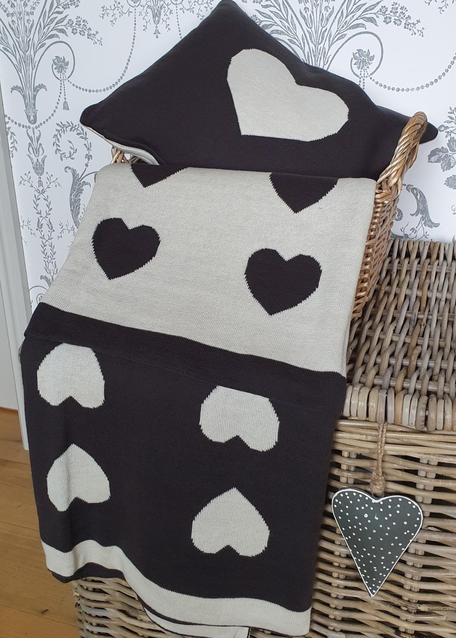 A beautiful knitted two way heart cushion , cream with a dark grey heart on one side and dark grey with a cream heart on the other side .Super soft 100% cotton. Removable zipped cover and feather filled cushion pad .