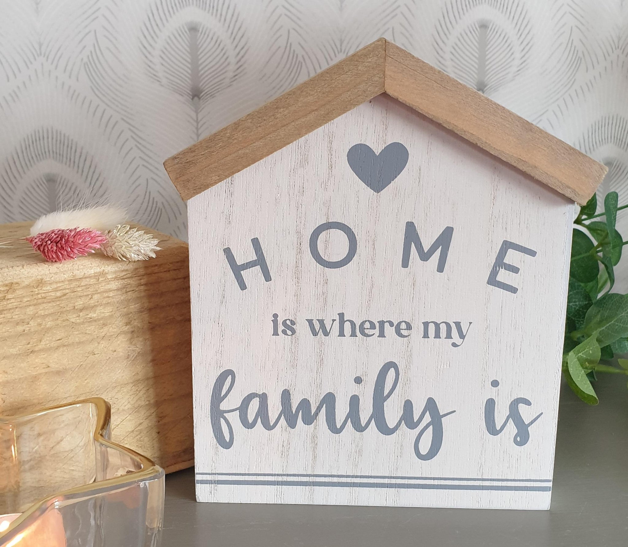 A beautiful wooden styled block in three different styles , 'Home is Where My Boys Are', 'Home is Where my Girls are ' or 'Home is Where my Family is' - painted white with grey script.