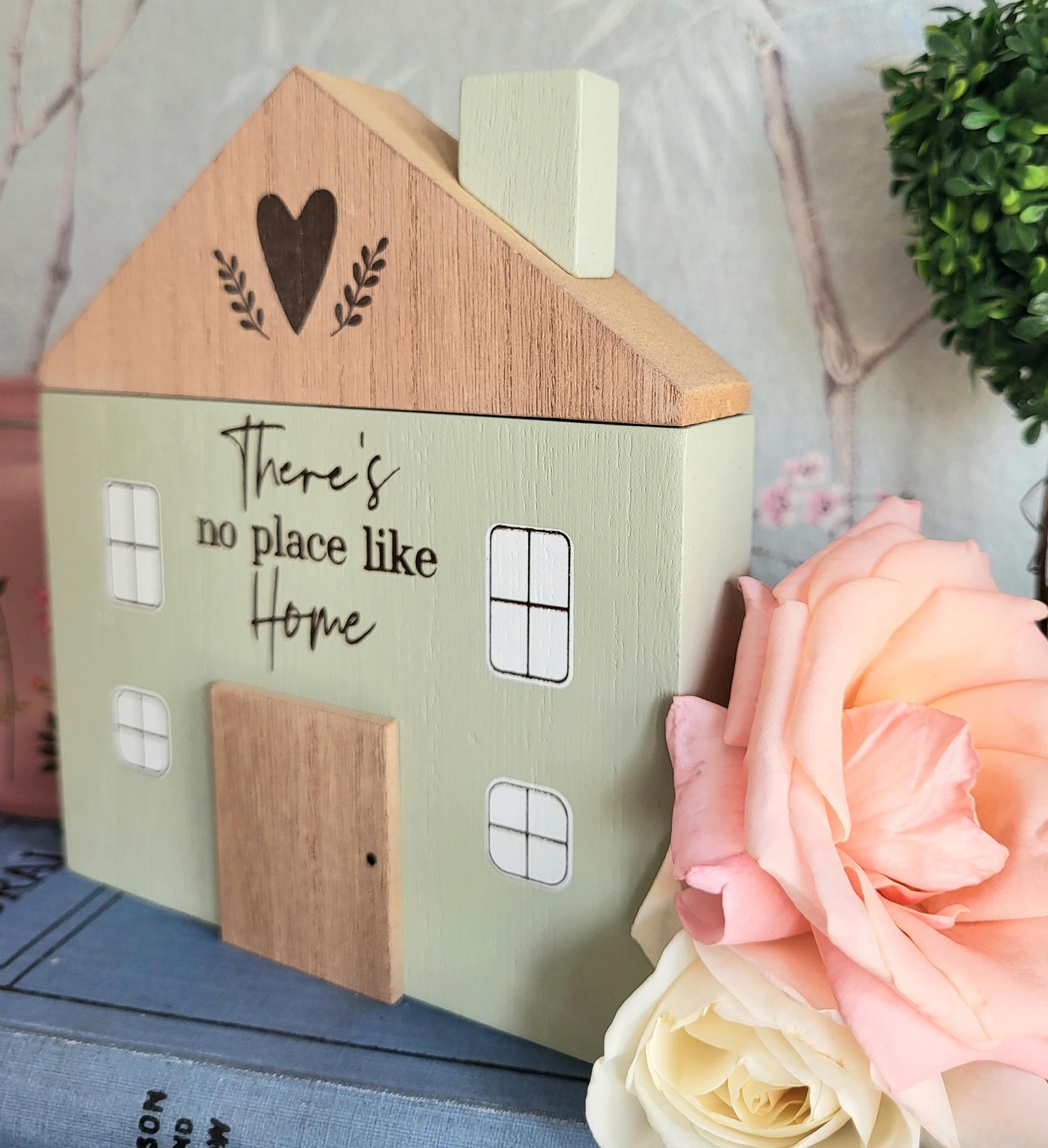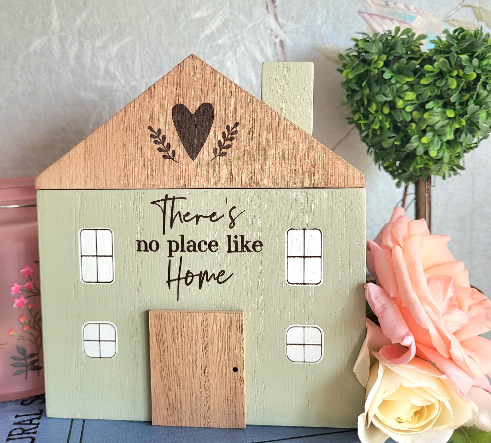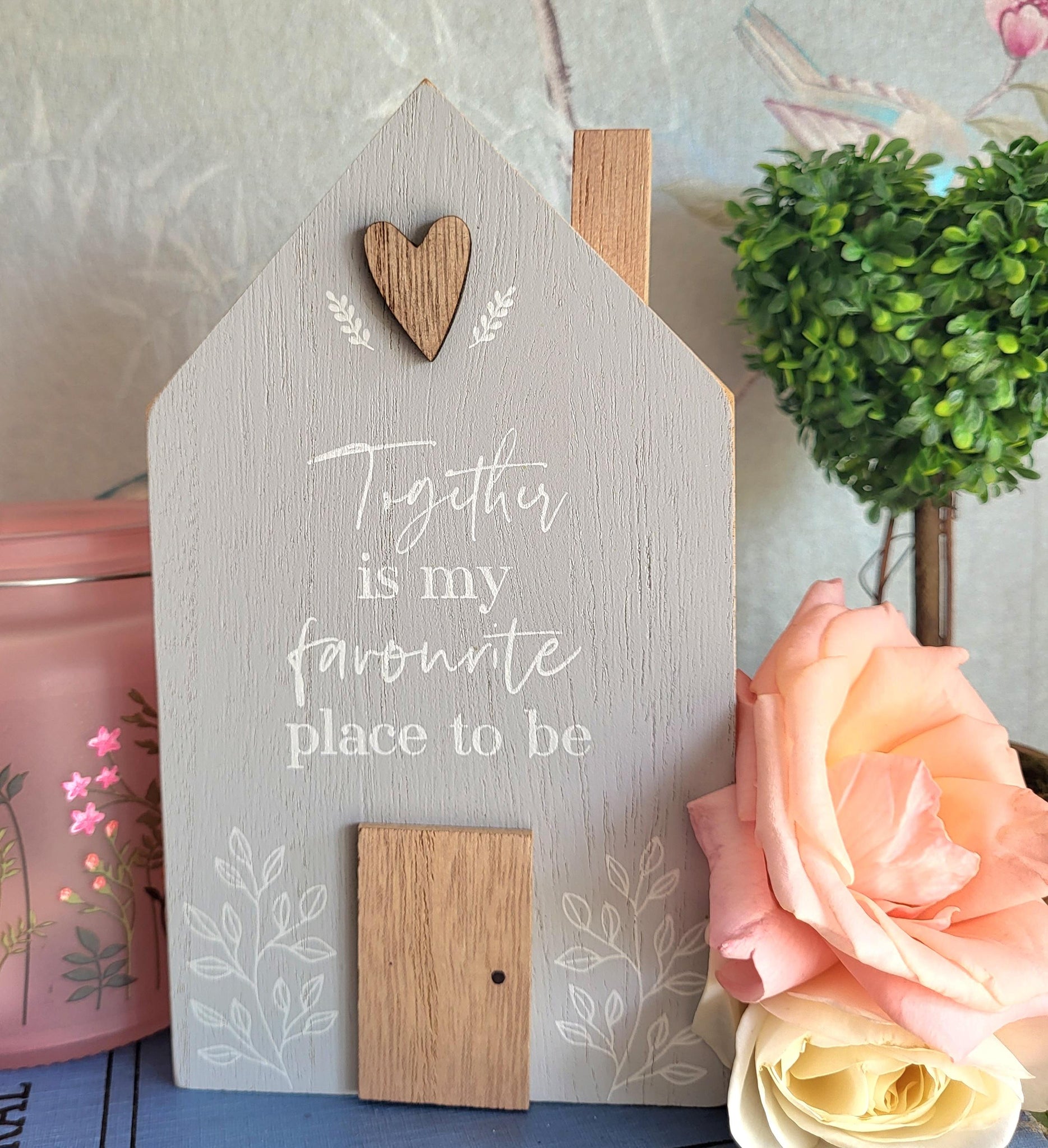 Beautiful chunky wooden blocks shaped like houses with different patterns and sentiments .The largest is painted white with pale green leaf pattern and the words 'Family Makes a house a home' , the pale grey house has white floral pattern and the words 'Together is my favourite place to be' and lastly the gorgeous pale green and natural house saying 'There's no place like Home'.